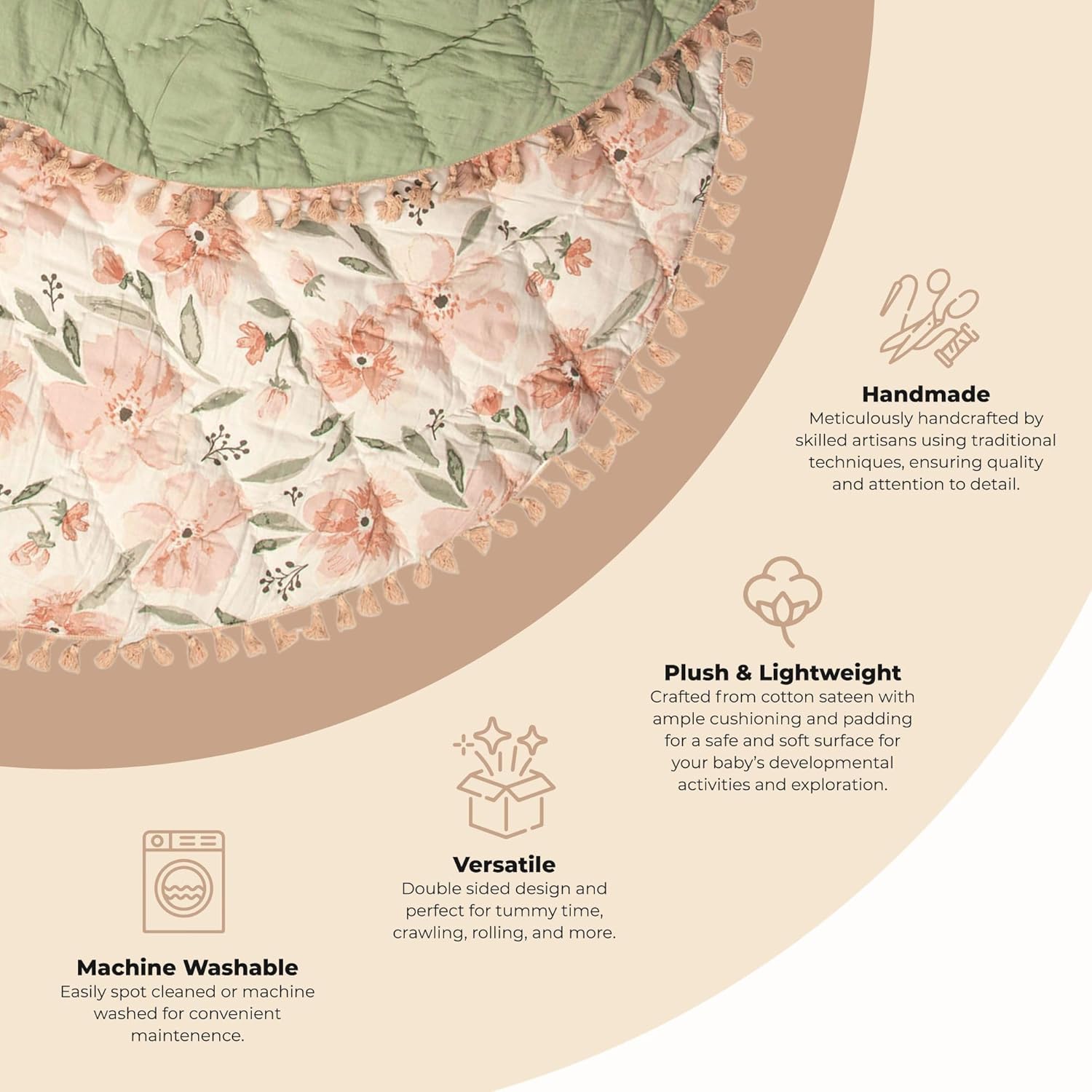 - AESTHETIC DECOR: Elevate your baby's room aesthetics with our tummy time play mat, a chic decor piece that complements our floral crib sheets. More than just a mat, this baby tummy time mat stimulates your baby's senses and fosters cognitive development.