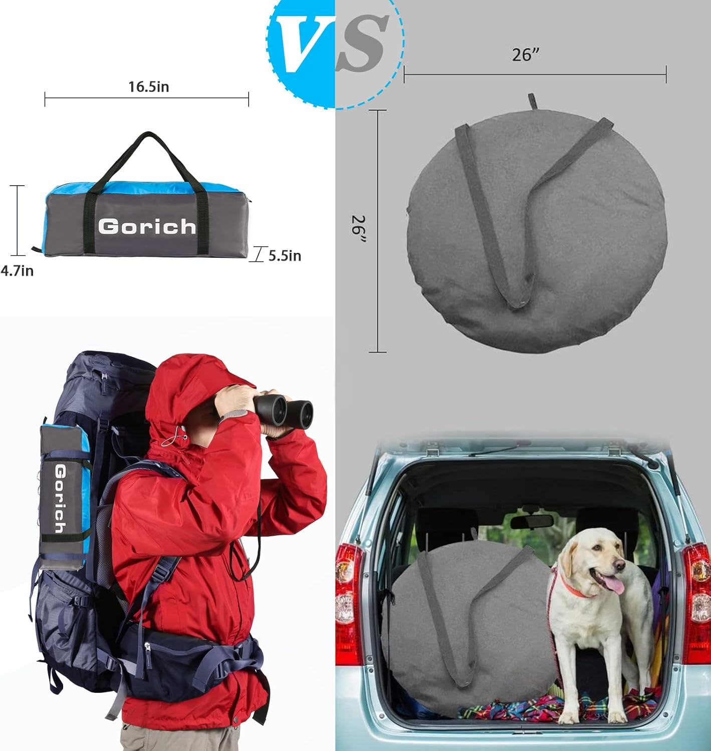 - Easy Set Up & Carry: Setting up fast within minutes. Gorich beach tent is much easier to fold than any kind of beach tents. It could fold down to a travel size of 16.5"L x 5.5"W x 4.7"H, weights 4.85 lbs. With a campact carrying bag, you can put it in your backpack, much easier to carry
