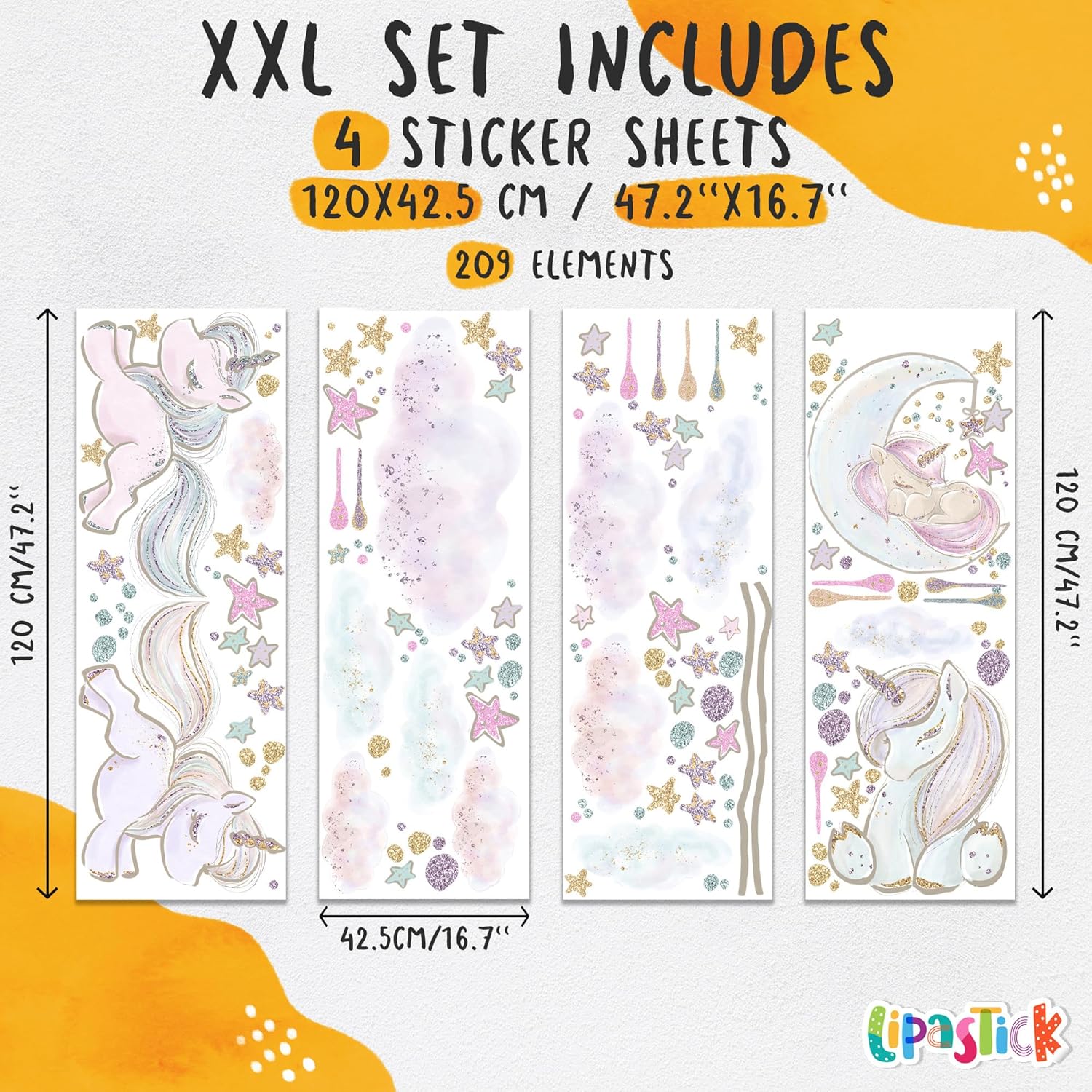 - ๐ฆ Package Content: Large decals for baby room come in a pack of 4 sheets. Includes: unicorns, stars, clouds, moon. The sheet size is 47.2" x 16.7". This set of stickers is size XXL and its finished size is 156.2" x 48โ. Perfect for covering full wall.