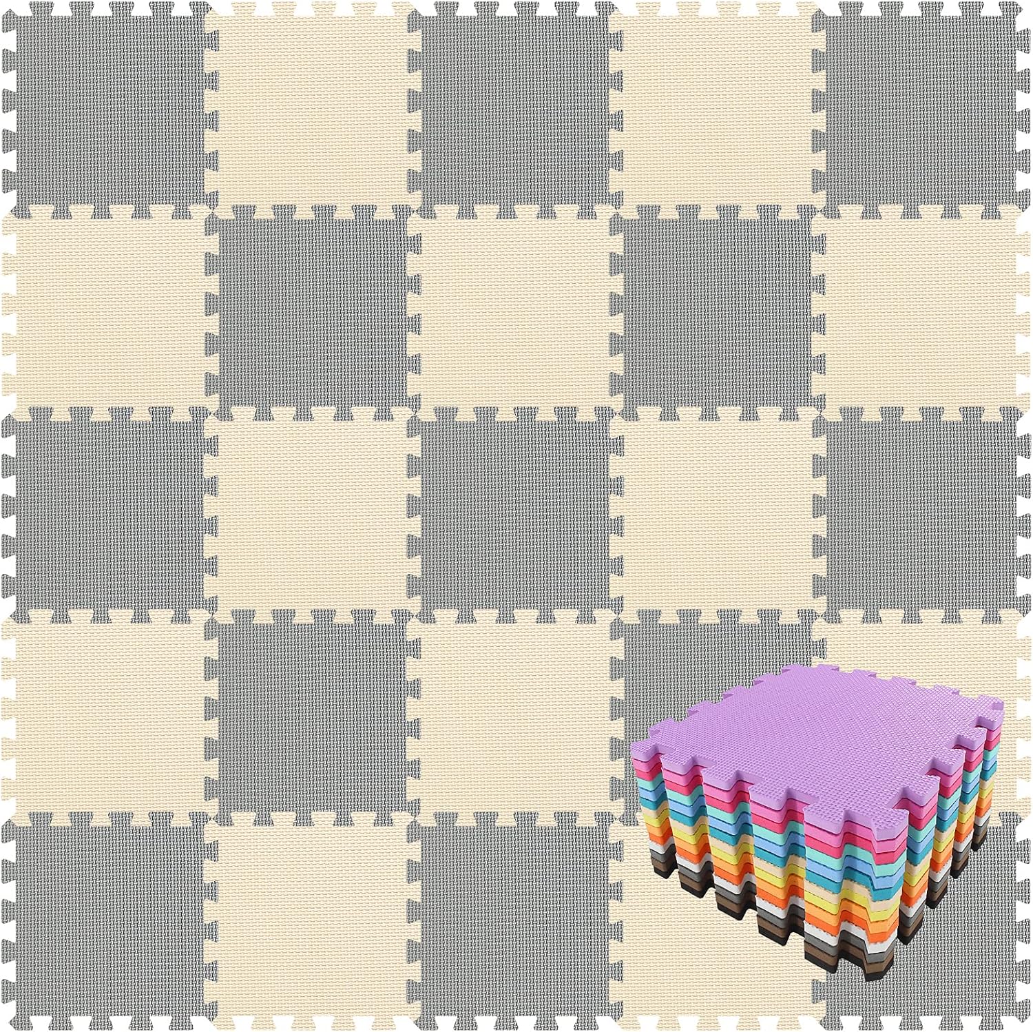 qqpp EVA Rubber 18 Tiles Interlocking Puzzle Foam Floor Mats - Baby Play Mat for Playing | Exercise Mat for Home Workout. Beige, Gray. QC-JLb18N