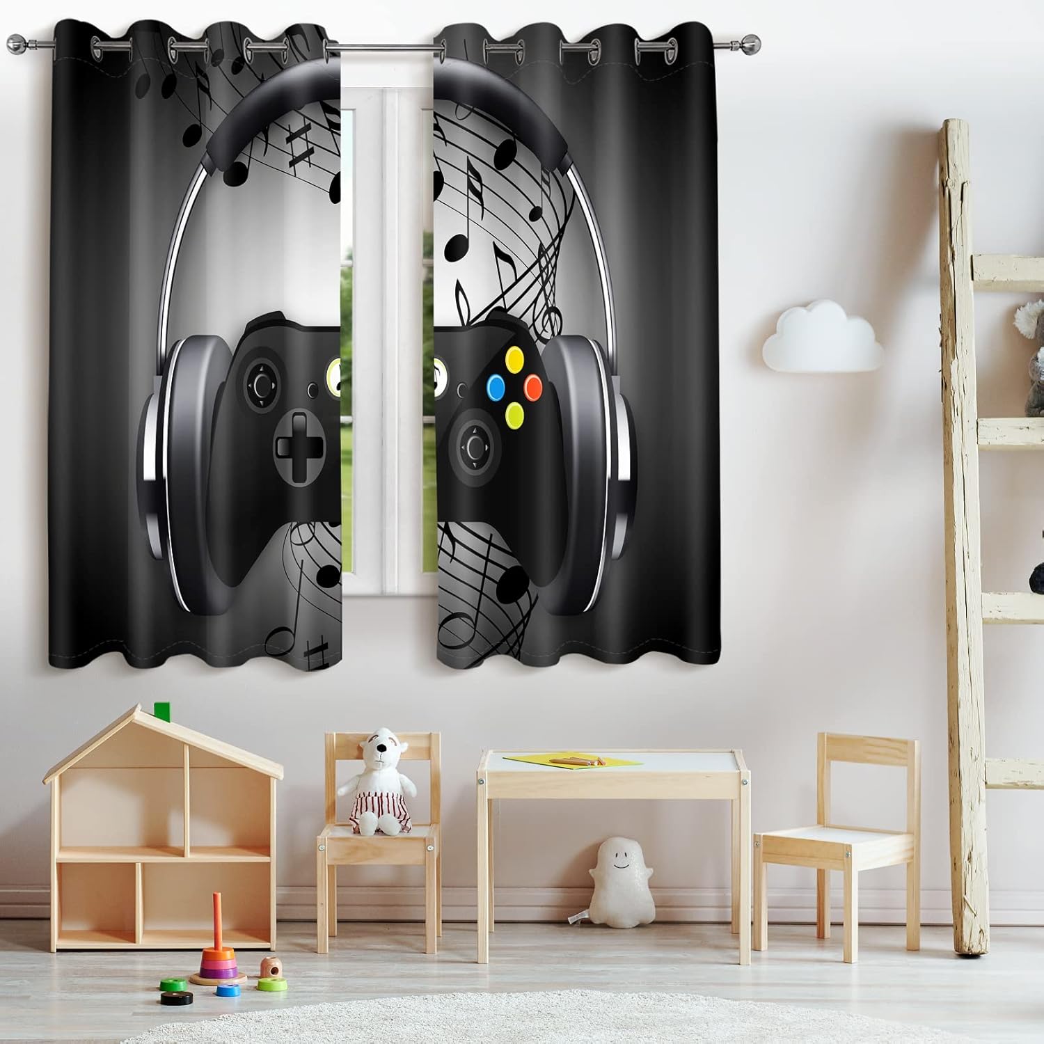 Jekeno Game Controller Blackout Curtains for Kids Boys Bedroom Black Grey Headphones Musical Notes Gamer Gaming Video Games Gamepad Decor Room Darkening Grommet Window Drapes 2 Panel Set, 42"x63"