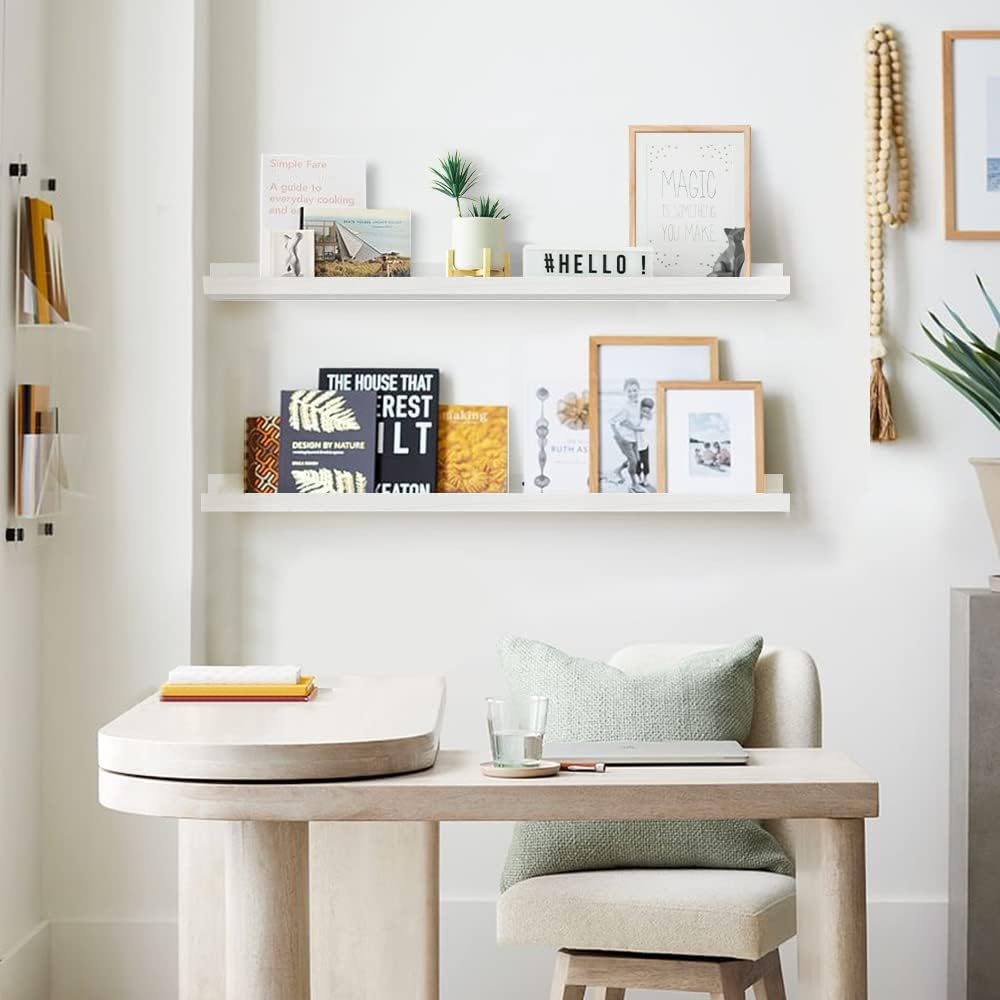 - ăSuitable for All OccasionsăThe sleek, simple design of wall mounted floating book shelves allow them to match with nearly any aesthetic. The wall ledge shelf can help to declutter or free up counter space in your office and bedroom to make places much tidier and neater.
