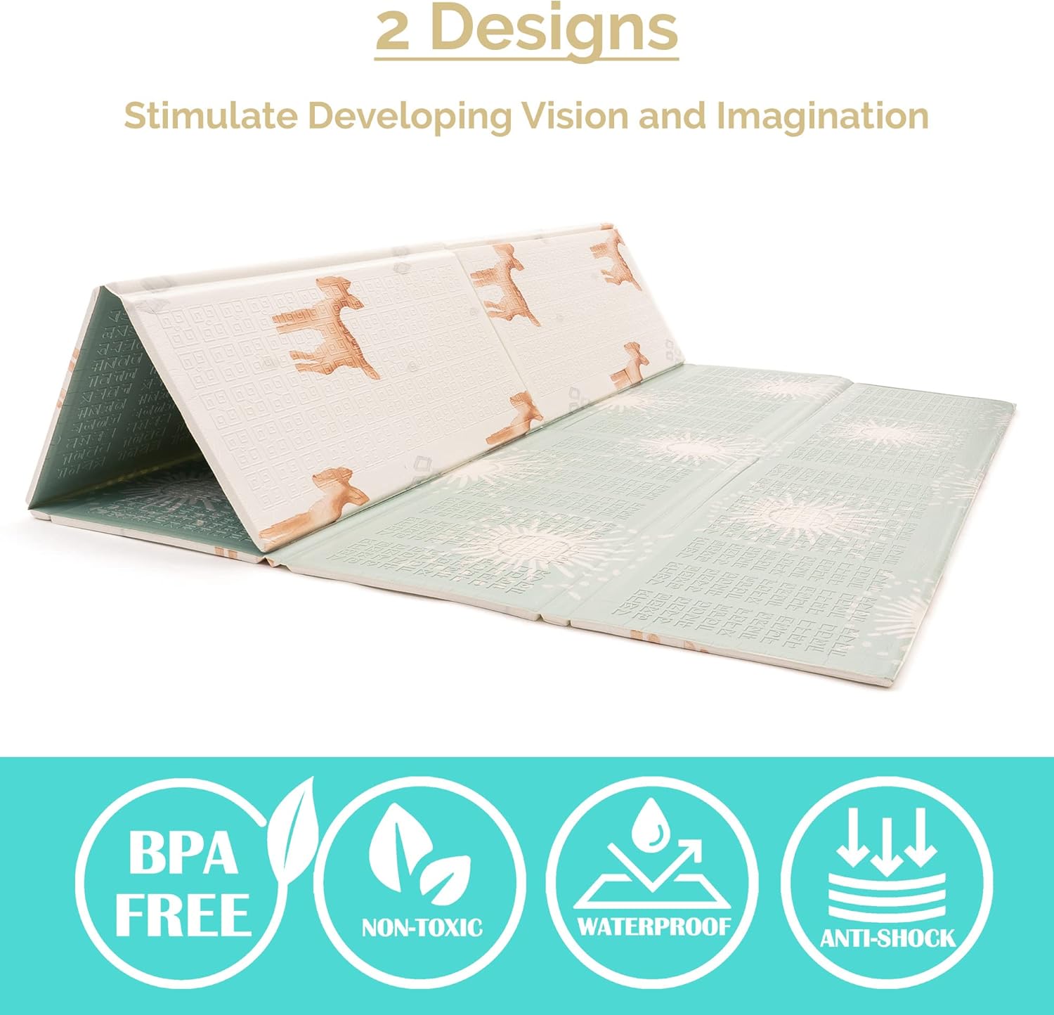 - Space To Play - This extra large baby play mat clocks in at 77 inches by 70 inches with a thick 0.6 in. padding, giving your little one plenty of space to crawl, play, or take a nap after they’re tuckered out