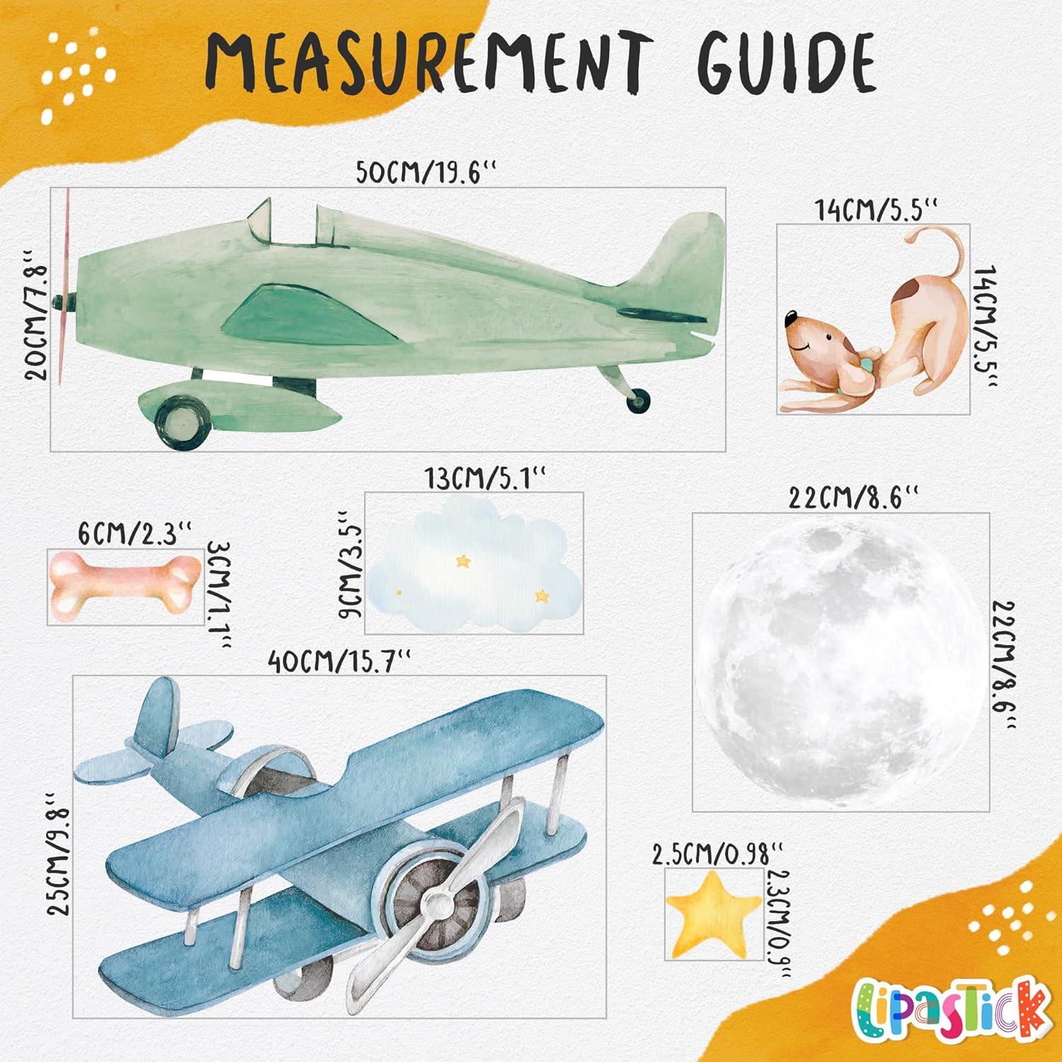 - โ๏ธ Kids wall decals: Airplane classroom decor comes in a pack of 4 sheets. Includes: airplane, stars, dogs and clouds. The sheet size is 15.7" x 11,8". This set of airplane decals for boys room is size M.