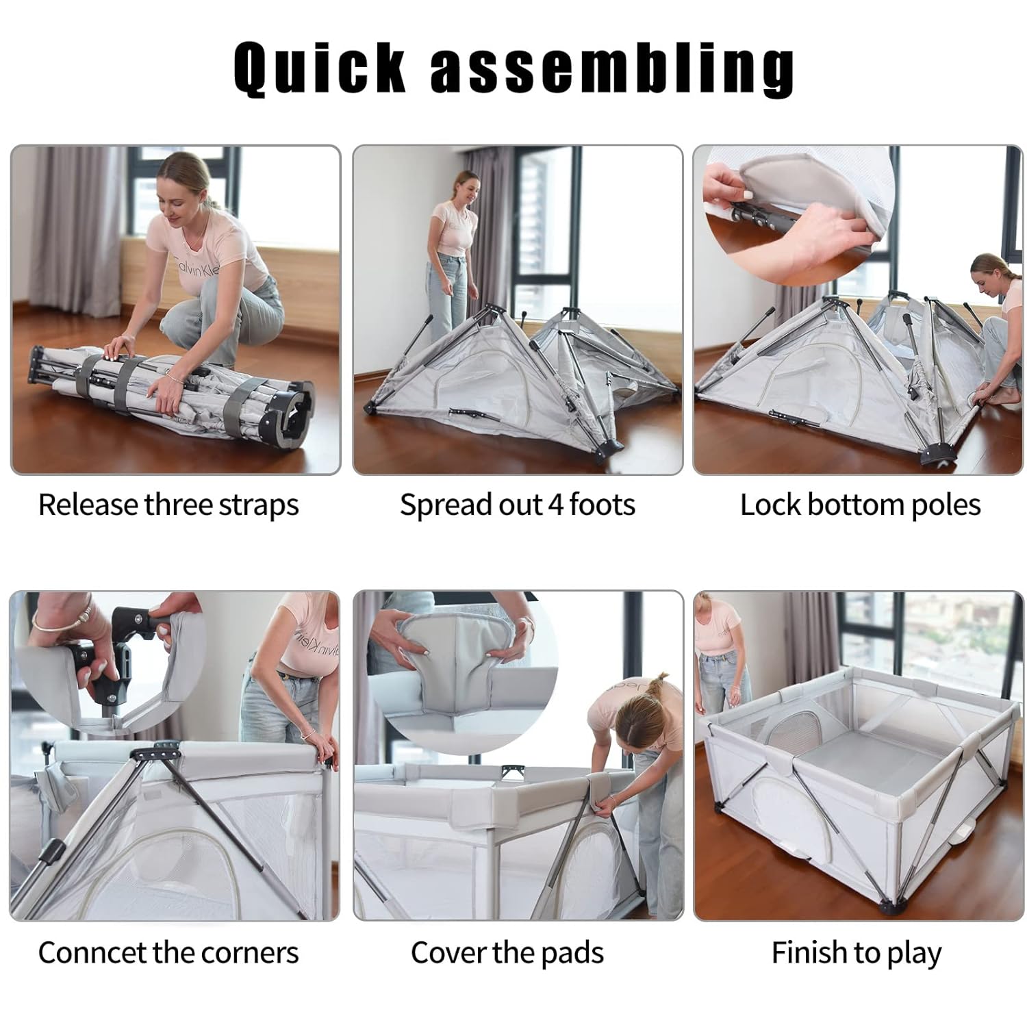 - [SAFE AND STURDY] The foots of playpen for babies and toddlers are made of non-slip silicone and designed to be curved for any household floor such as blanket, wood, ceramic tile, so they can be sturdy on the floor; playpen has had 8000 push and pull tests in independent third-party laboratory, fully meeting the physical structure requirements of ASTM.