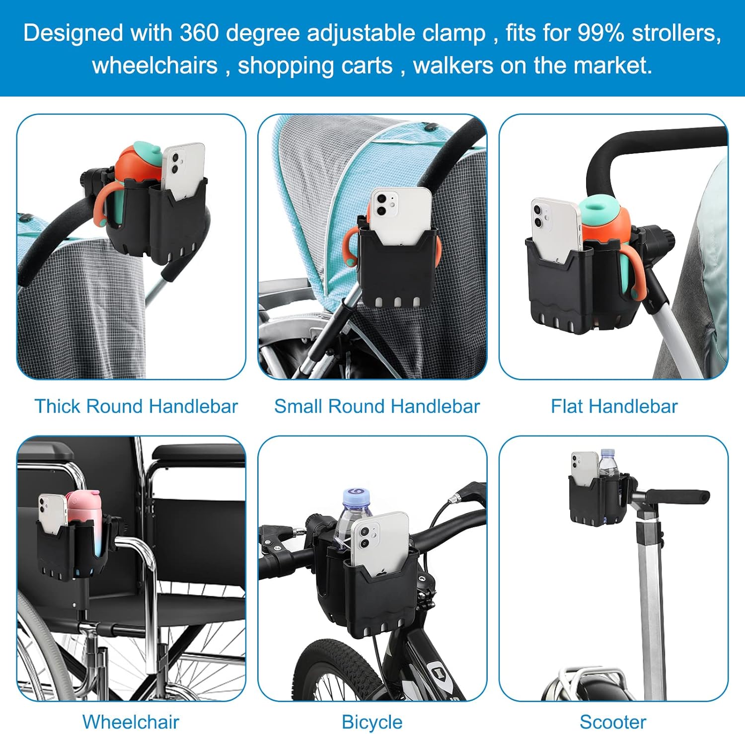 - This stroller cup holder with a phone holder, it can load drink bottles and mobile phones at the same time. You can see new messages, incoming calls in the first time. It fits for most mobile phones.