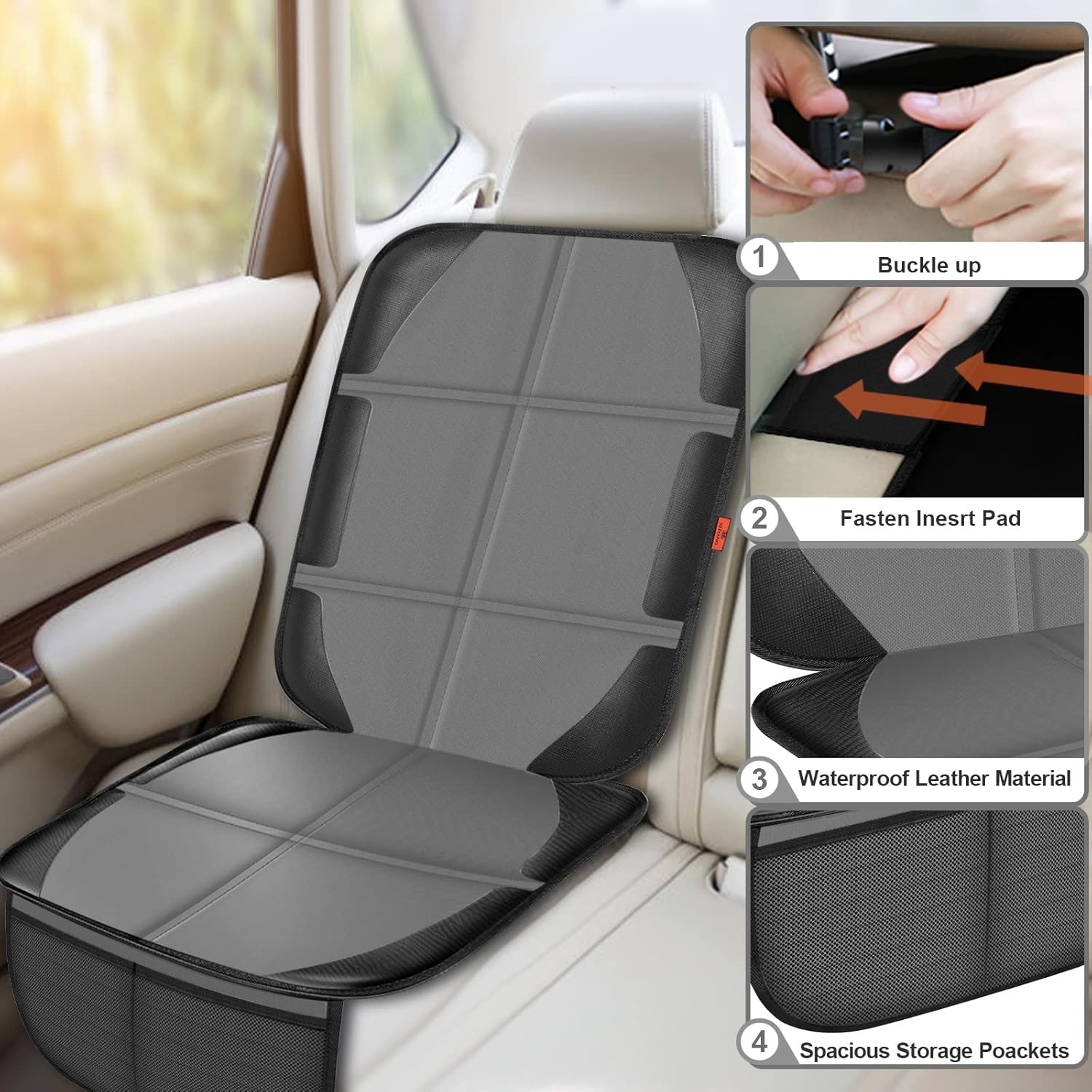 - 【ANTI-SLIP DESIGN & ADJUST STRAPS】:Non-skid material on top and bottom to prevent car seat from shifting,Securely fasten them to achieve a perfect fit. Forget about seat protectors sliding off the seat,The car seat mat has adjustable safety straps that will tie the cover securely to the headrest. Securely fasten them to achieve a perfect fit