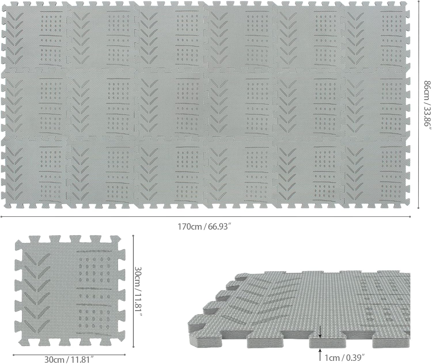 - BABY PLAY MAT SIZE - 18 Tiles interlocking 11.8"*11.8" square mats. The thickness is 0.39" , covers an area of 16 sq.ft after assembly.