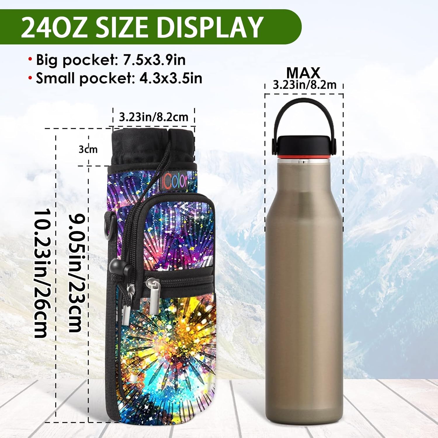 - icolor Wide Mouth Water Bottle Carrier Holder Pouch with Call Phone Bag have 4 size 25oz(Diameter 3.23",Height 9.05")/32oz(Diameter 3.82",Height 7.87")/40oz(Diameter 3.82",Height 9.05")/64oz (Diameter 5.12",Height 9.06"),Adjustable Padded Shoulder strap about Min:27.1, Max:48.4"