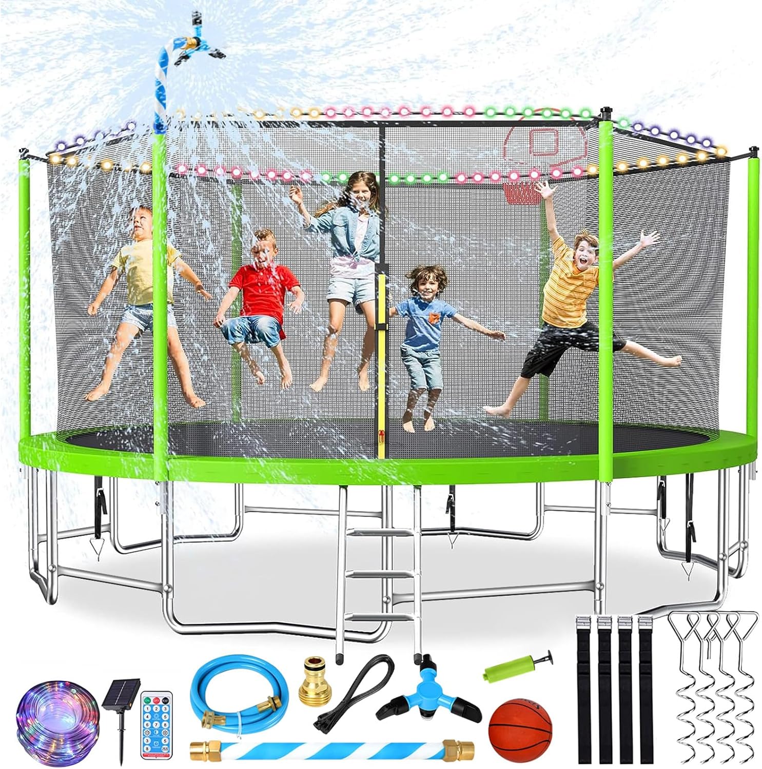 Upgraded 10/12/14/15/16FT Trampoline Outdoor, Large Kids Trampoline with Light, Stakes, Sprinkler, Backyard Trampoline with Basketball Hoop and Net, Capacity for 4-6 Kids and Adults