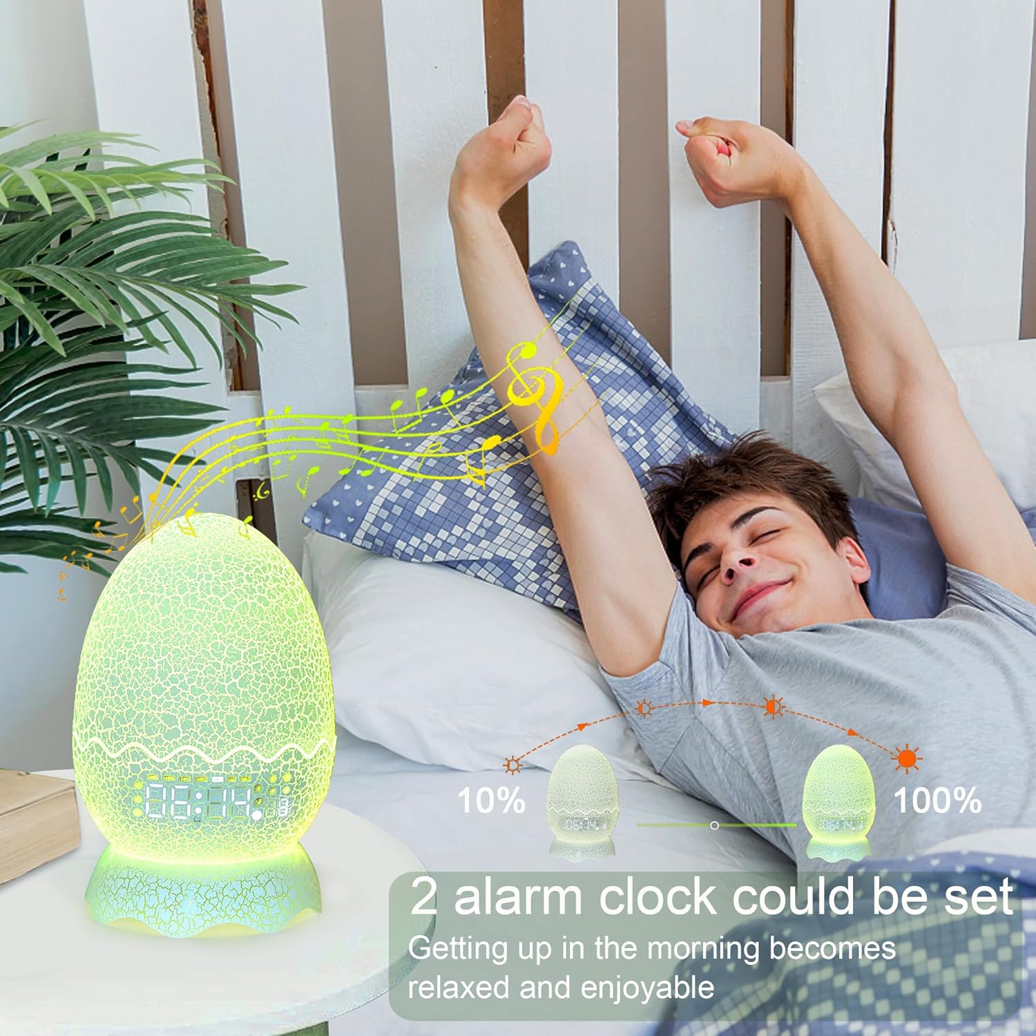 - 【Bluetooth Speaker &White Noise】Dinosaur egg alarm clock after Connected the device via Bluetooth to turn it into a music player, play your favorite music & books. Dinosaur lamp Built in 9 types of sounds such as,forest bird calls, wave sounds, rain sounds, dinosaur roar etc. This is a cool dinosaur egg decoration.