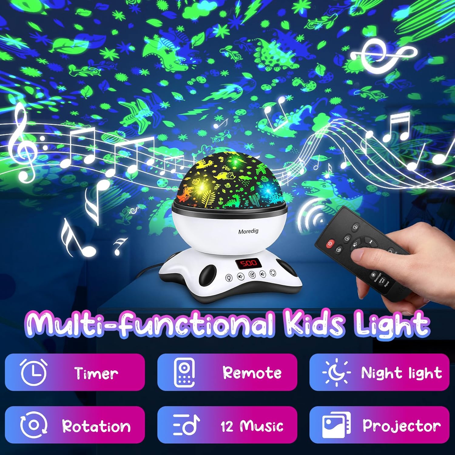 - Multi-functional Night Light Dinosaur - Rotating function of baby night light for nursery enables "dinosaur" to move on the ceiling or wall. With 12 different styles of soft music, you can switch the song, volume level and play mode by remote control, which can be used with the kids projector night light mode to fall asleep peacefully. Help kids overcome the anxiety brought by independence, but also help parents reduce the trouble of putting to bed