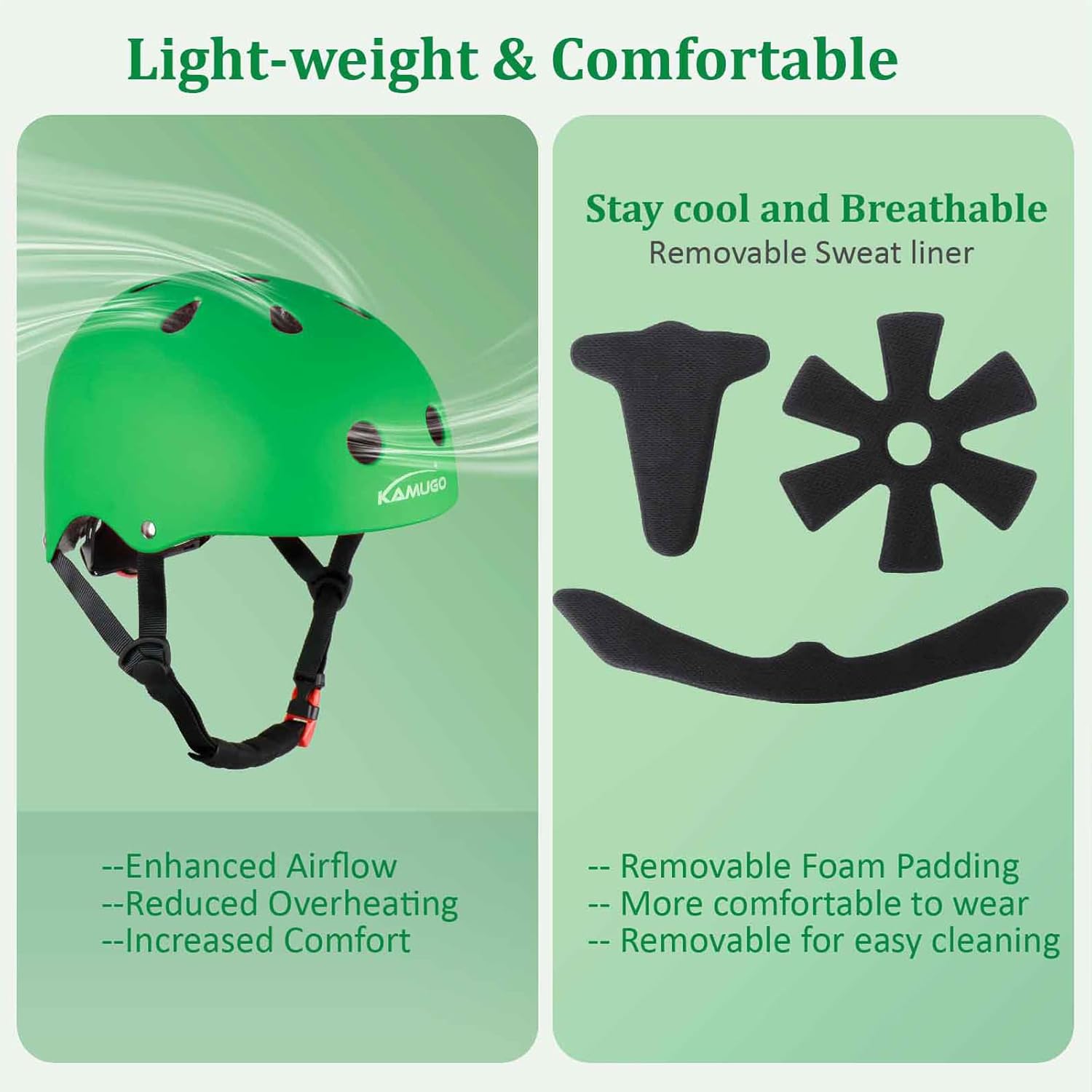 - 【Meets Safety Requirements】- KAMUGO sport toddler helmet for kids is tested and complaint with federal children's product safety requirements. Made of impact-resistant ABS shell and high density EPS foam, equipe with protective gear set. Effectively protect your kids from injuries during multi-sports