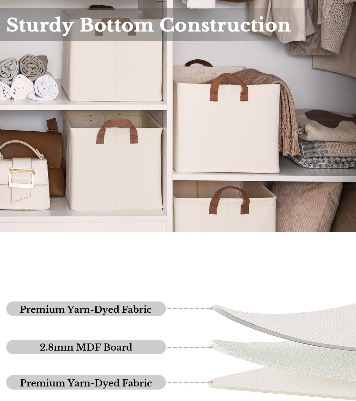 - Premium Quality: Made from high-quality fabric and reinforced with a heavy-duty MDF bottom board and a sturdy metal frame. The solid construction enables the storage bins to stand upright without support, even when empty.