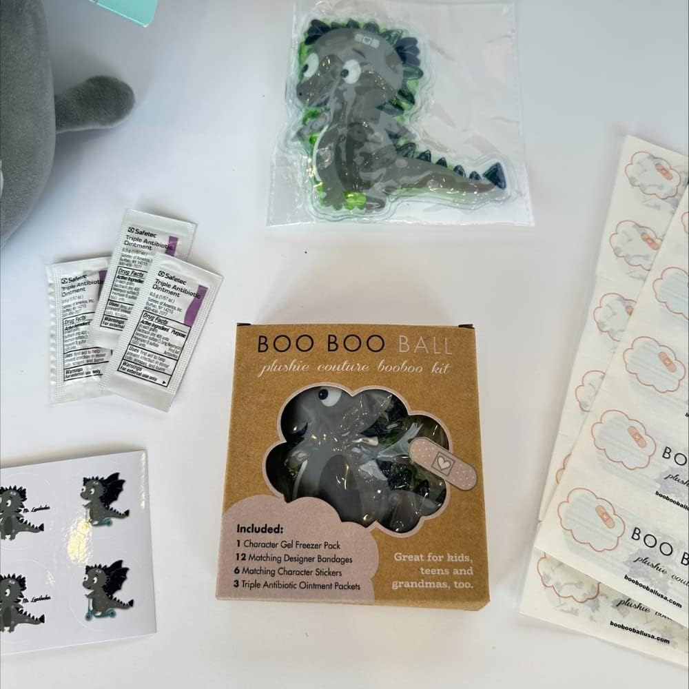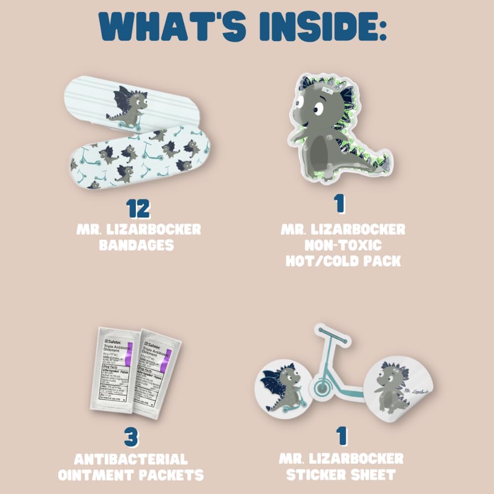 - 🦸♂️ The Set Includes: This kids first-aid kit plush includes 1-character ice pack (for hot & cold use), 12 matching Mr. Lizarbocker Dragon bandages, 6 Mr. Lizarbocker Dragon stickers, and 3 triple ointment packets. This infant first aid kit is packed in a secret zipper pouch on the stuffy’s back.