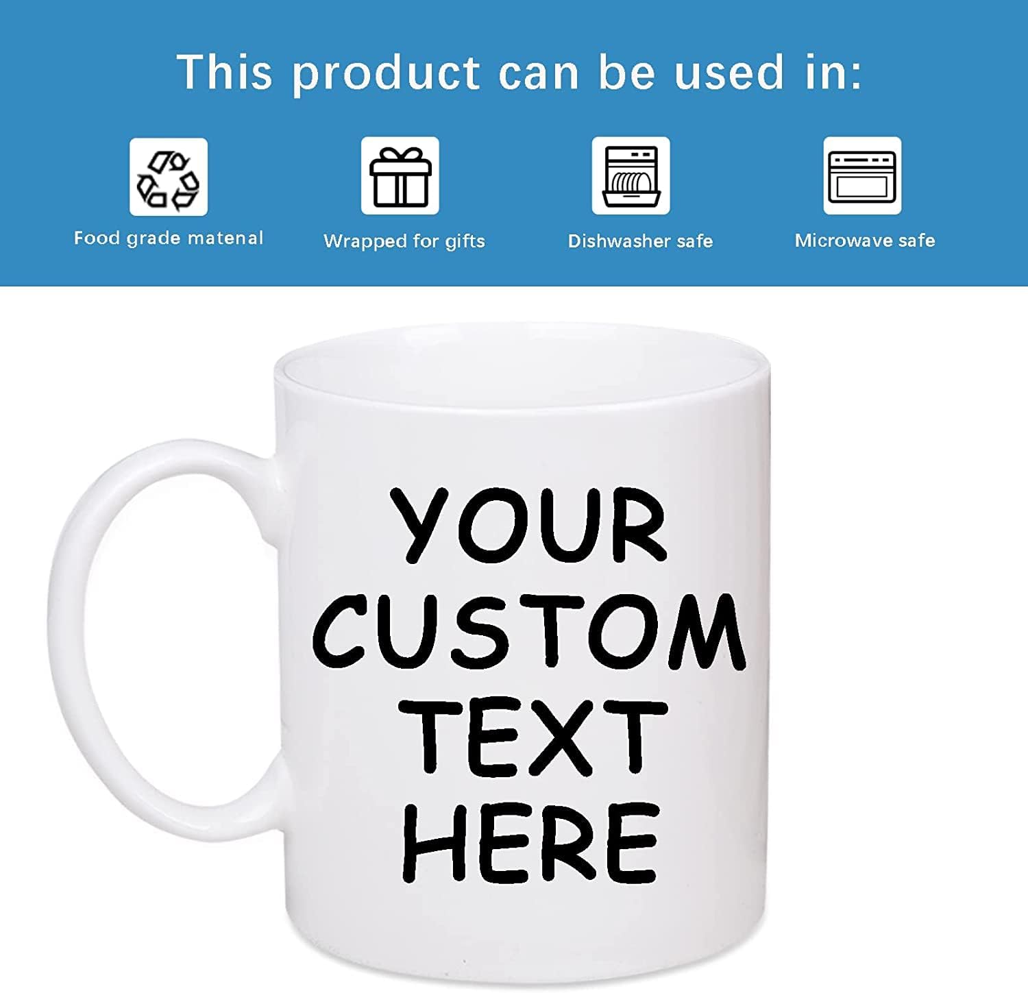 - DURABLE MUG - Durable customizable mug is made from non-toxic ceramic material which make it safe for consuming hot or cold beverages. It is easy to clean with dishwasher and healthier to use than paper cups. Personalized cup is safe and break/chip resistant for Microwave even with hot water or heat. Multi-use product for daily use, perfect for coffee, tea, hot cocoa, and soup. It holds up to 11 ounces of liquid.