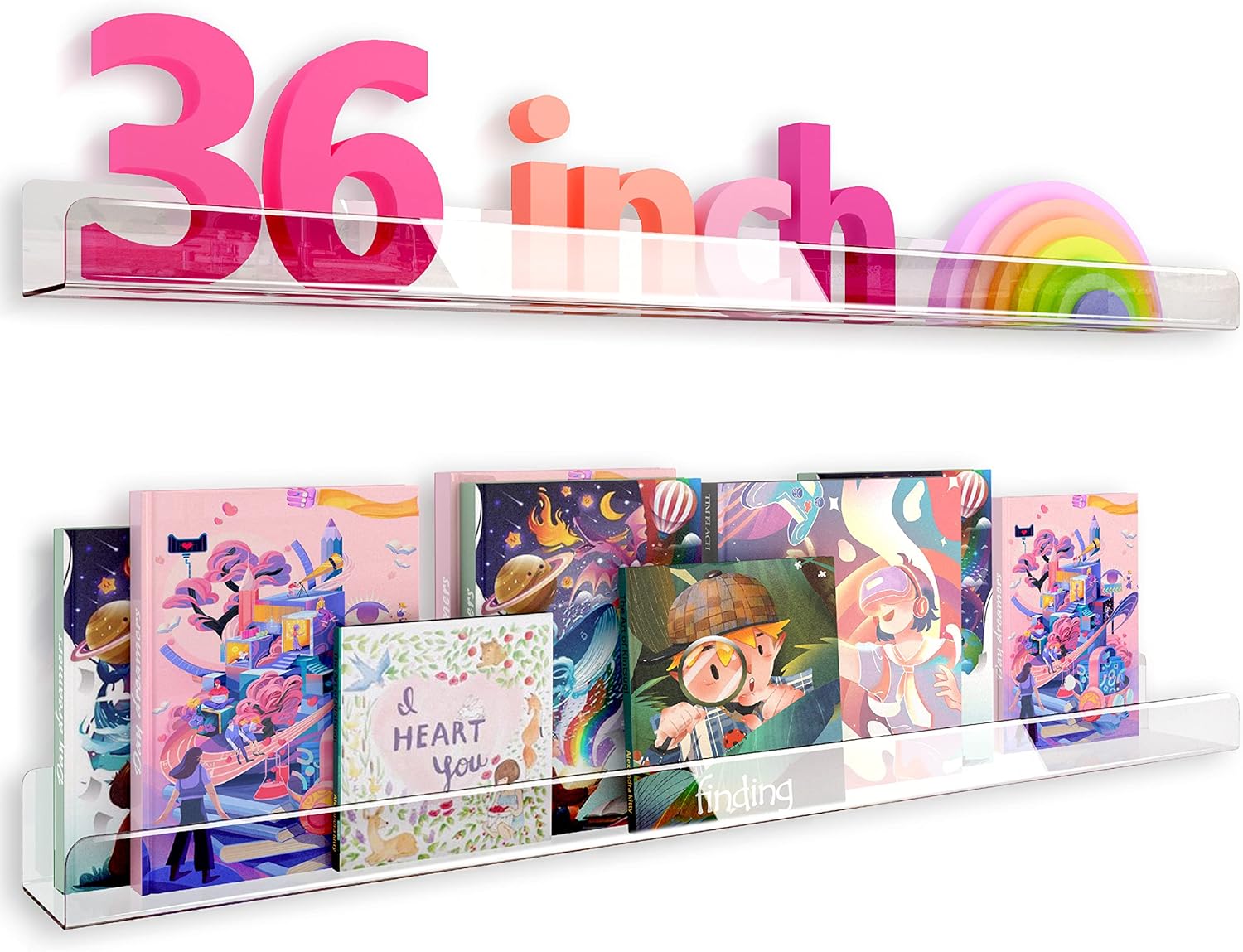 36 Inch 50% Thicker Clear Acrylic Book Shelves, Invisible Kids Wall Bookshelves for Baby Storage Book Rack, Toy Organizer, Book Display, Playroom, Bedroom, Toddler Room, Nursery 2 Packs