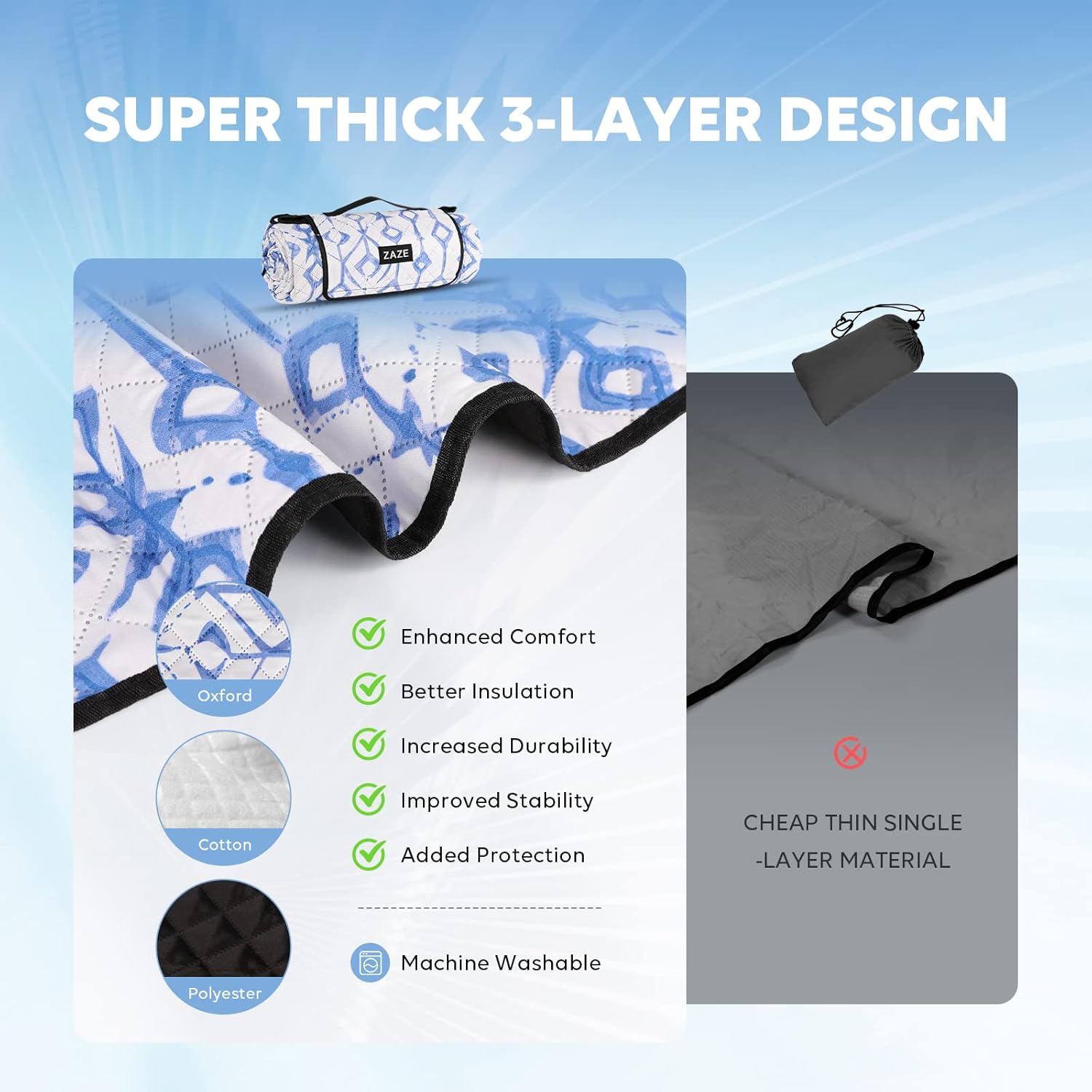 - Safe and Cozy with Padding 3-Layers: ZAZE picnic mat has thick and sturdy fabric on the top, soft cotton for middle, and durable fabric backing. The 3 layers of the ZAZE beach blanket provide extra cushioning and comfort for sitting or lying on the beach, insulation from the hot sand during summer to protect your skin, and a barrier between you and rough or uneven terrain