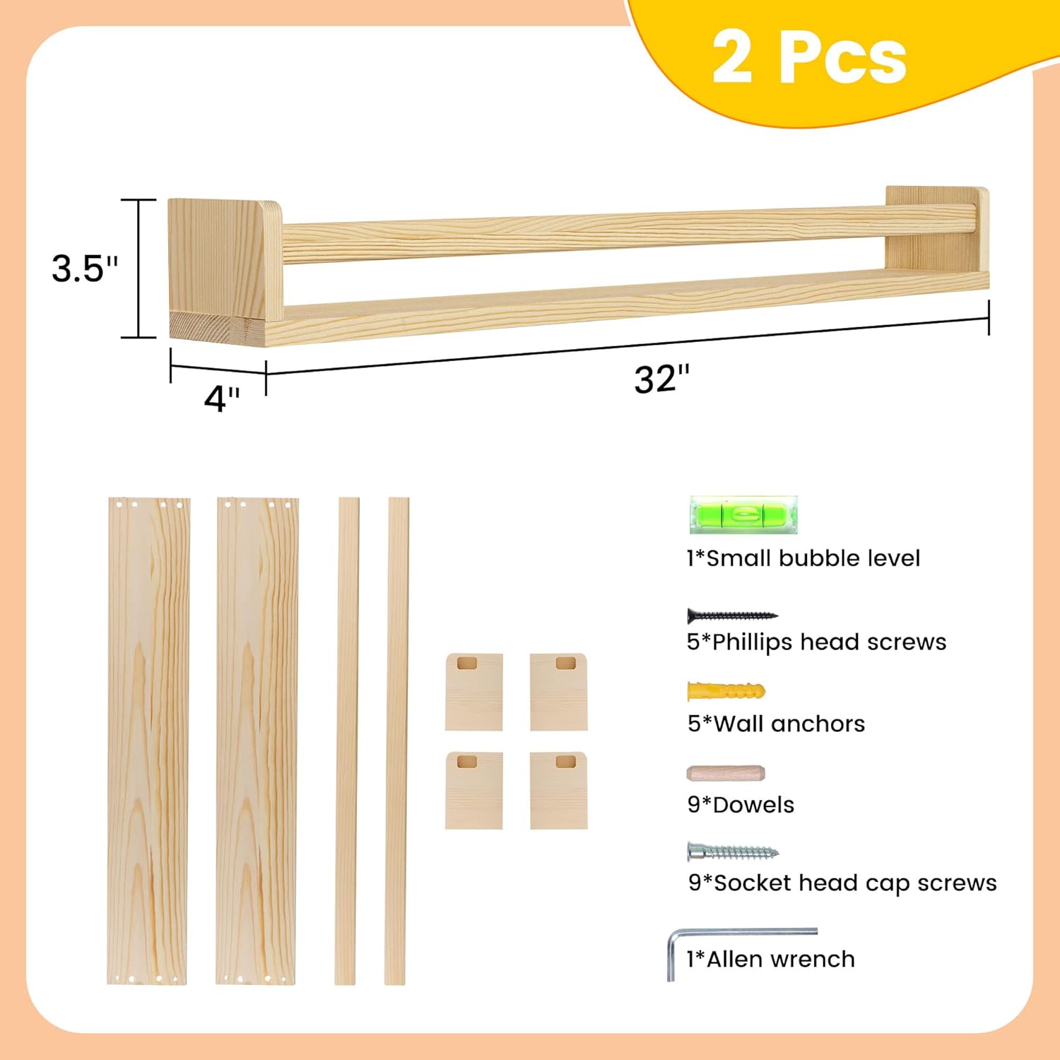 Fun Memories Nursery Book Shelves - Rustic Natural Solid Wood Floating Bookshelf for Kids - Wall Book Shelves for Kids Room (Natural, 32inch - 2P)