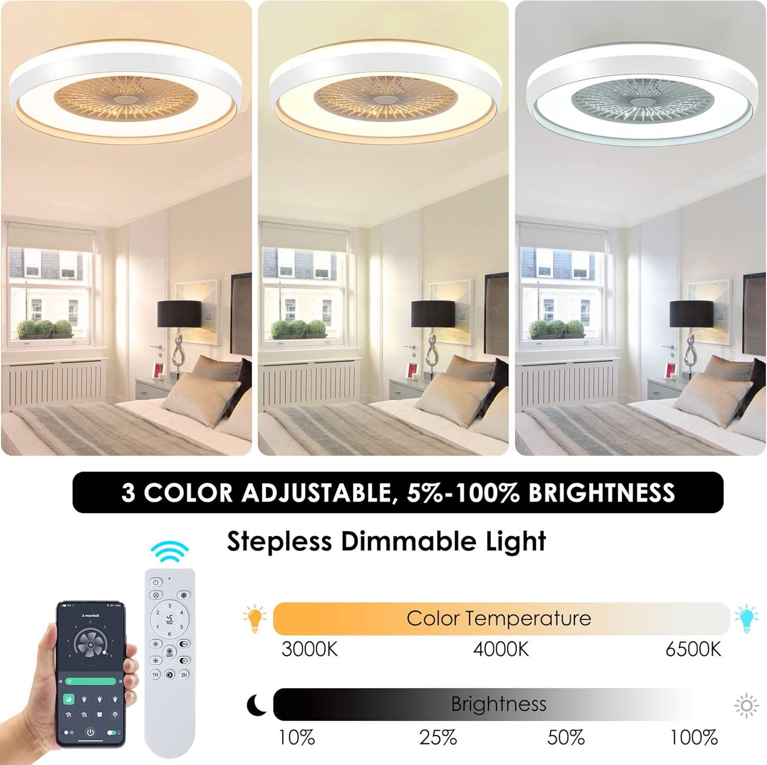 - " 3-Dimmable LED Light: Enjoy three light colors (white, warm, neutral) and three-speed options on this low profile ceiling fan with lights remote control. The stepless dimming feature also allows you to easily adjust the brightness. Fan and LED lights are separate functions that can be used simultaneously or separately"
