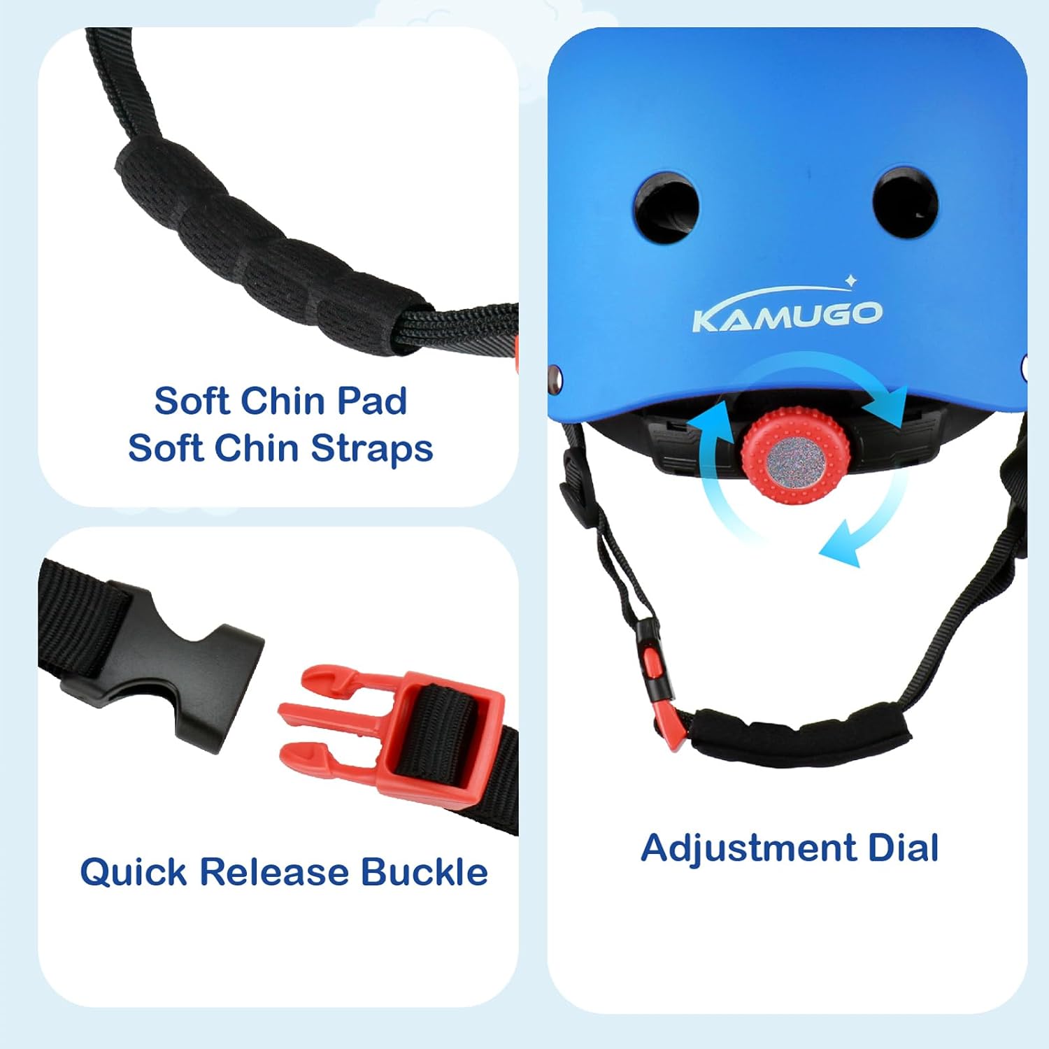 - PREMIUM PROTECTION FOR YOUR KIDS: Suitable for children and toddlers with helmet size: 48-54 cm / 18.9- 21.3 inch.Contain 1 adjustable KAMUGO helmet, 2 knee pads, 2 elbow pads, 2 wrist guards, bring your kids all-round safety protection.