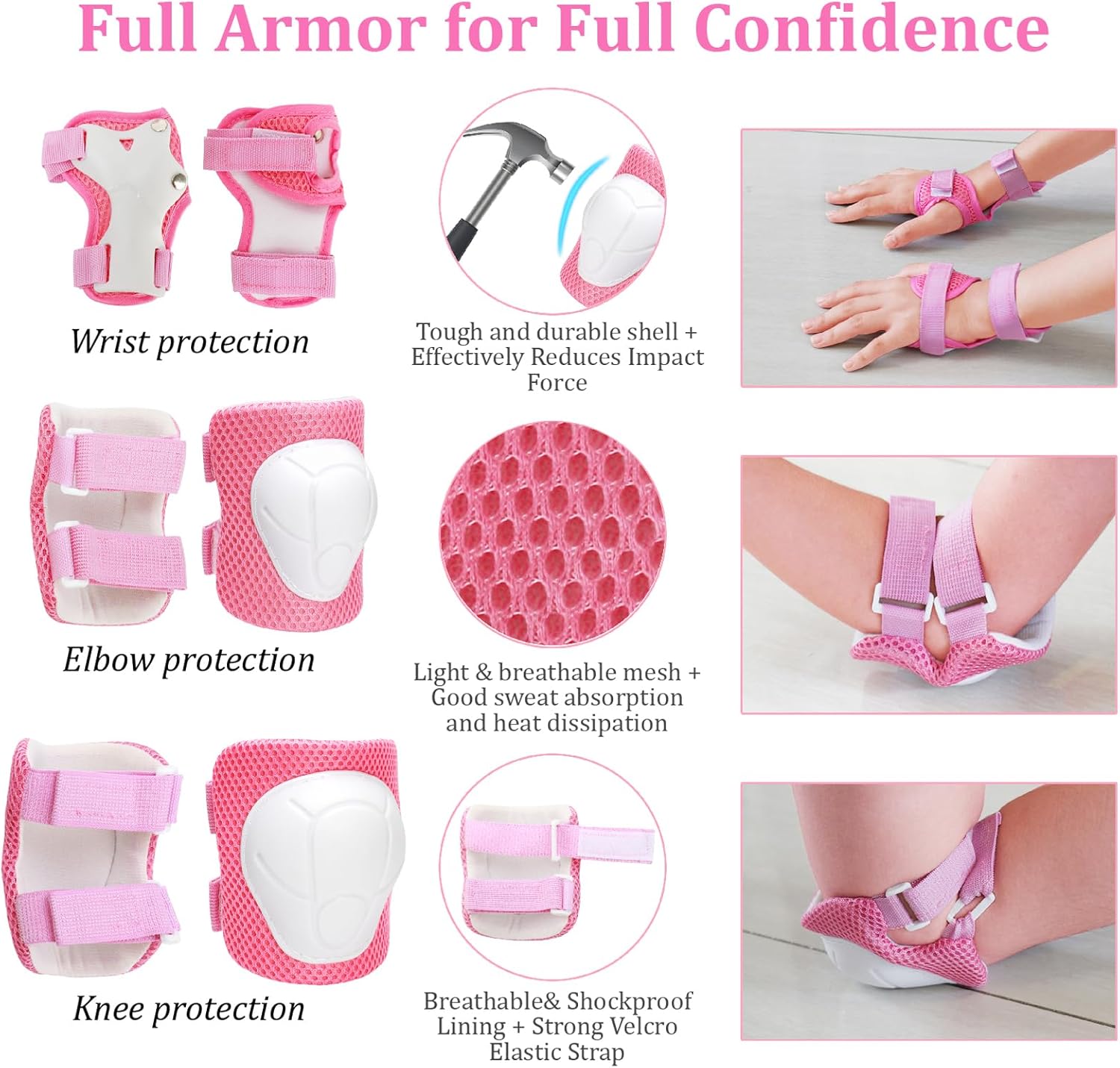 - 【7 pcs Kids Helmet Protective Gear】- Including 1 bike helmet, 2 x Elbow Pads, 2 x Knee Pads, 2 x Wrist Pads. Consist of anti-scratch extra hard ABS shell for hard protection, and adjustable straps ensure the protective gear will not shift. Provides your kids comfortable and safe, A great gift for toddler and kids age 3-8 years old