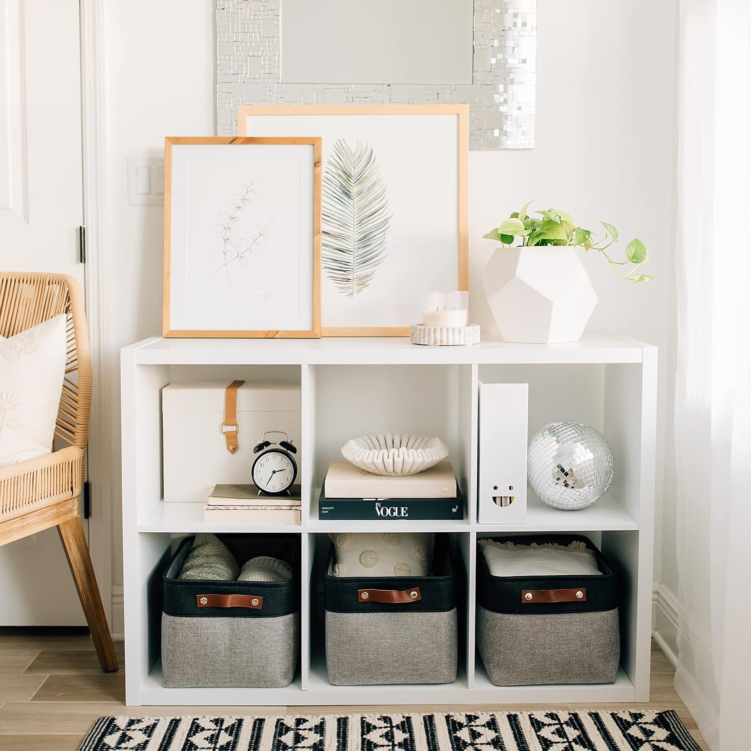 - Decorative Fabric and Vegan Leather โ These versatile storage baskets for organizing your everyday life are made with a thick, high-quality fabric and fitted with leather handles to add a stylish touch to a living room, bedroom, office, or personal space.