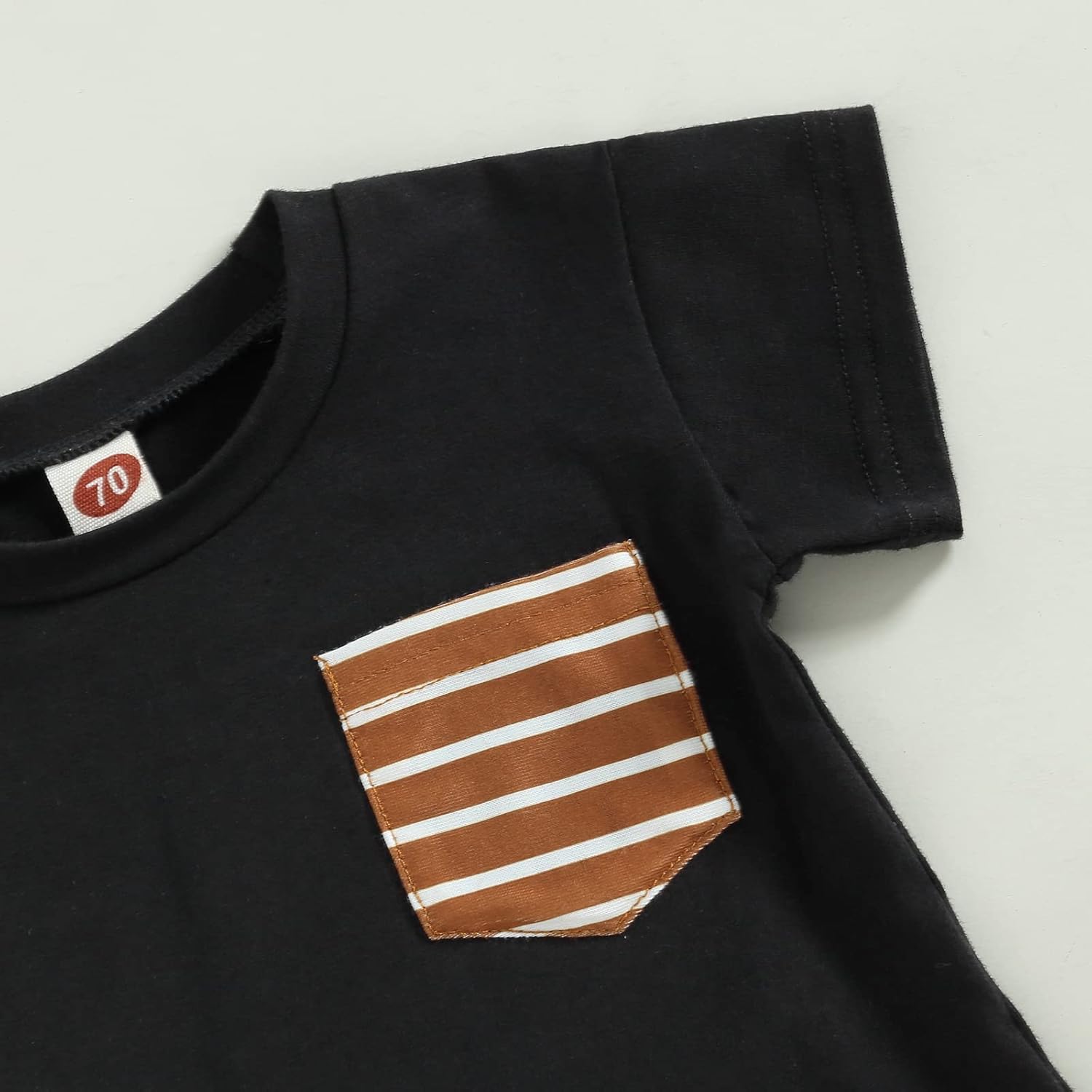 - Relax Crew Neck, One Pocket Front, Striped Pattern, Comfy Short Sleeve T Shirts Tee Tops, Elastic Waist with Drawstring Shorts, Side Pockets, Comfy and Cute Newborn Baby Boys Summer Outfits Clothes, Infant and Toddler Boy Comfy Cotton Shorts Sets