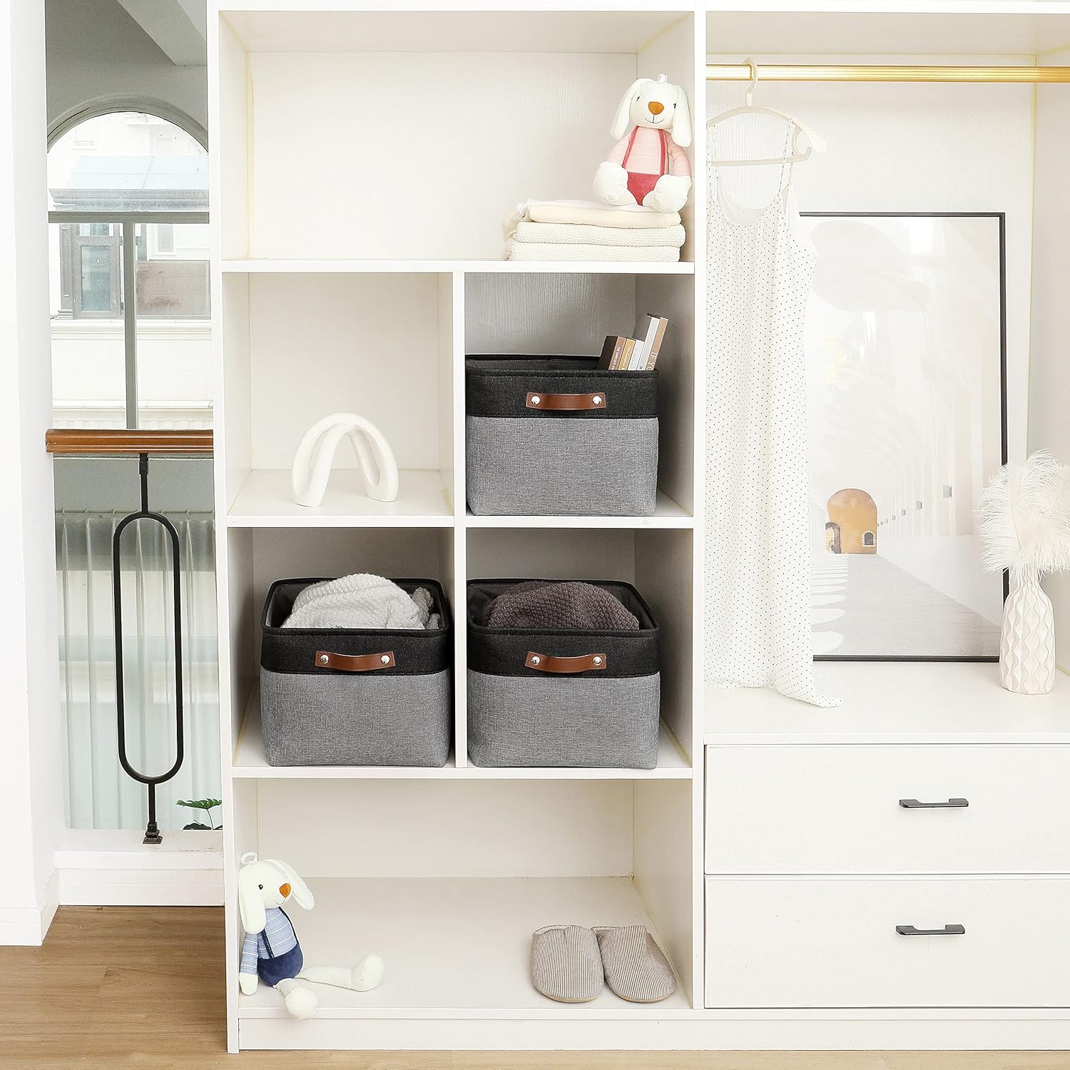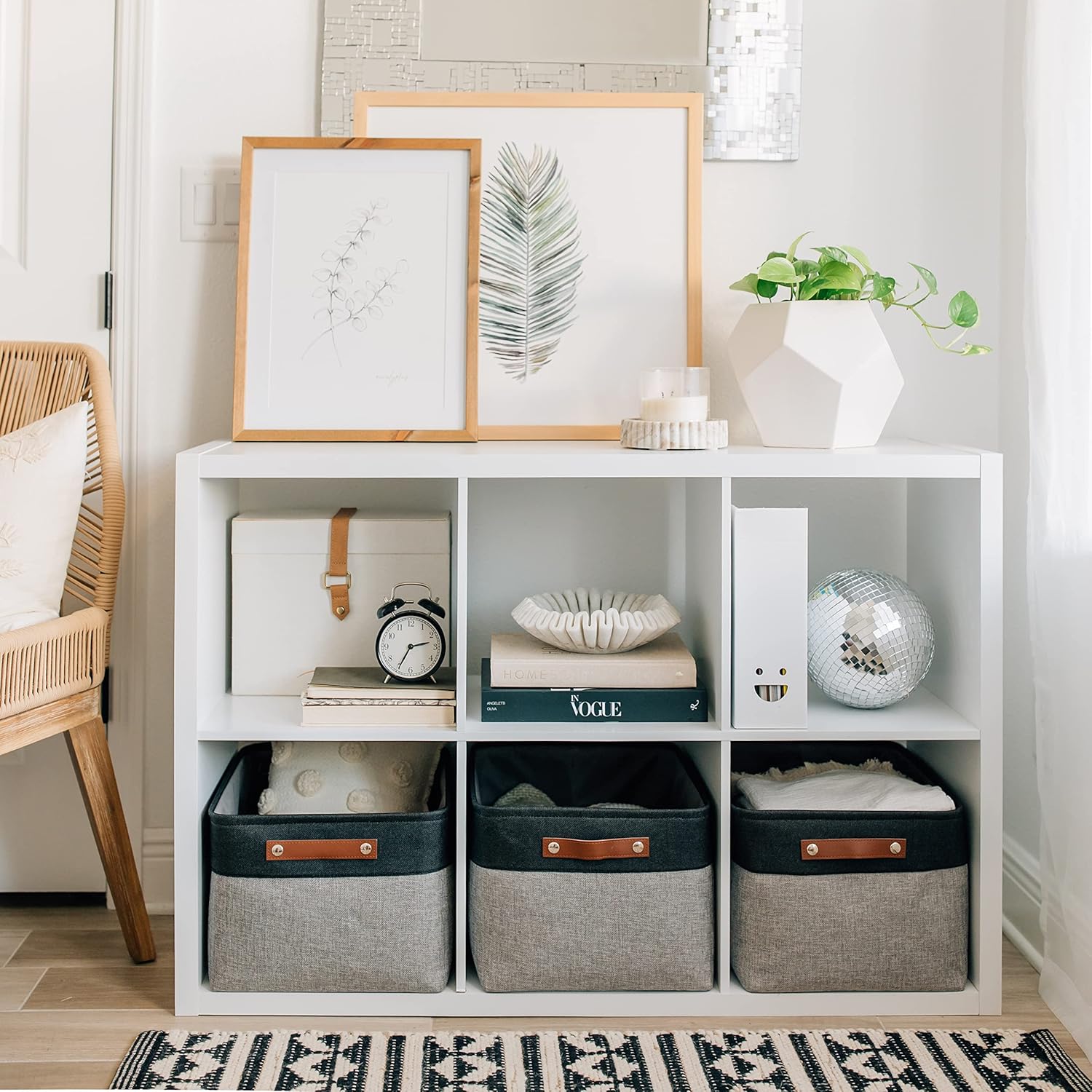 - Decorative Fabric and Vegan Leather โ These versatile storage baskets for organizing your everyday life are made with a thick, high-quality fabric and fitted with leather handles to add a stylish touch to a living room, bedroom, office, or personal space.