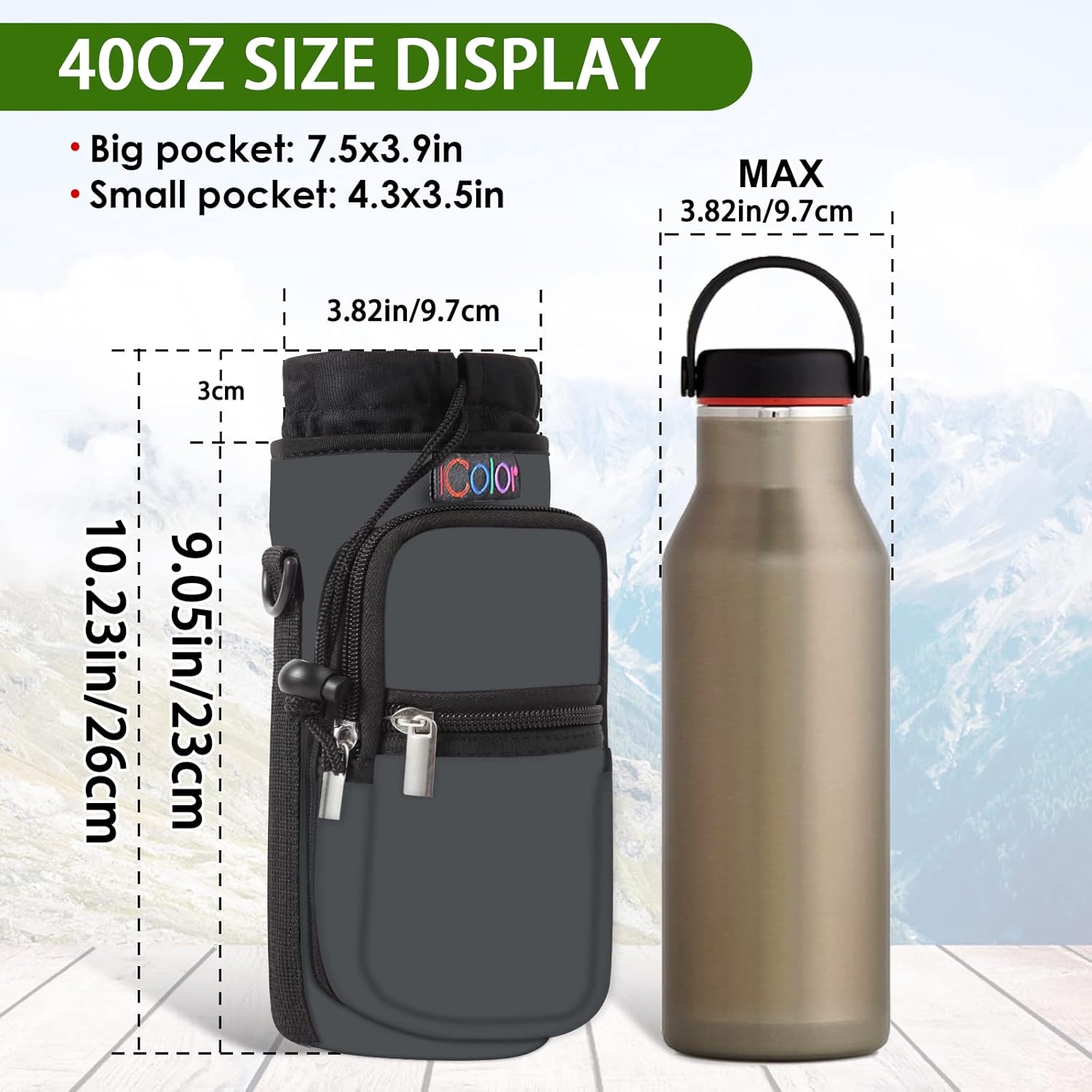 - icolor Wide Mouth Water Bottle Carrier Holder Pouch with Call Phone Bag have 4 size 25oz(Diameter 3.23",Height 9.05")/32oz(Diameter 3.82",Height 7.87")/40oz(Diameter 3.82",Height 9.05")/64oz (Diameter 5.12",Height 9.06"),Adjustable Padded Shoulder strap about Min:27.1, Max:48.4"
