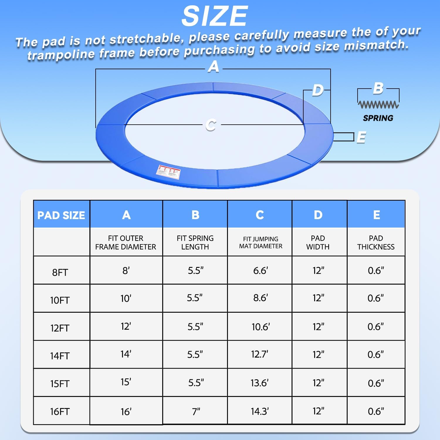- Universal Size: KENSONE trampoline replacement pad is made for universal use, fitted with most 8/10/12/14/15/16FT trampoline frame in the market. The pad is not stretchable, please carefully measure the size of your trampoline frame before purchasing to avoid size mismatch. We have presented detailed product size data in the product pictures for your reference