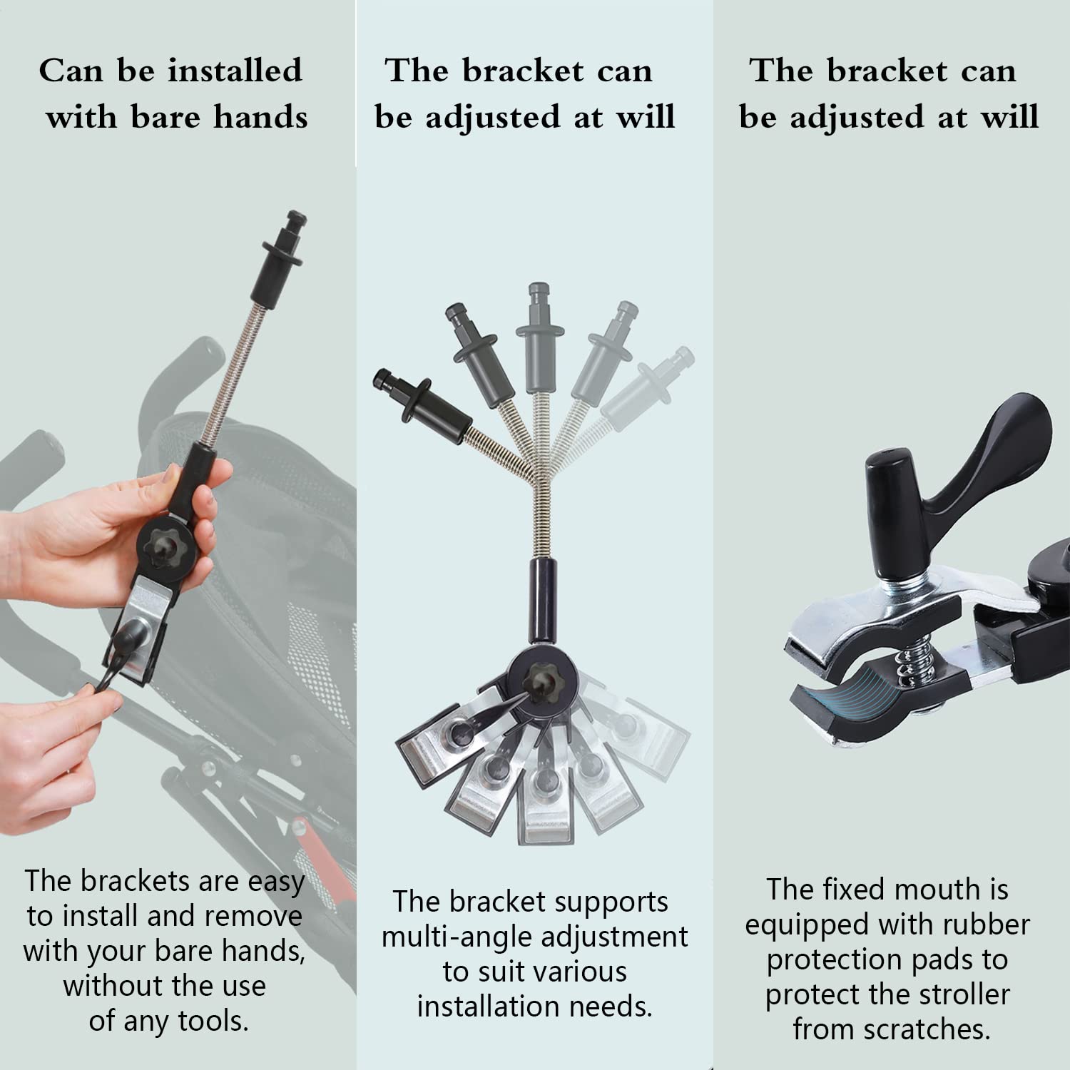 - 360° adjustable umbrella: The stroller sun shade has an Angle adjustment button Press the adjustment button to adjust the Angle of the stroller sun shade The elastic steel can bend 360 degrees and the umbrella can be adjusted in any direction