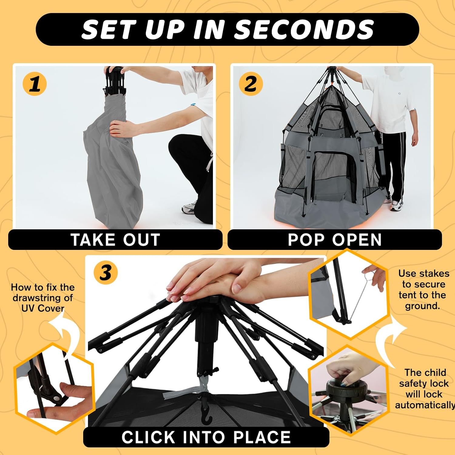 - Easy Assembly, This portable playpen for toddlers can be set up or fold down in seconds. Using our special pop & release technology, the baby play pen effortlessly unfolds and is secured with tent stakes. Safe, protective, spacious and durable for infants, baby to toddlers and “big kids”
