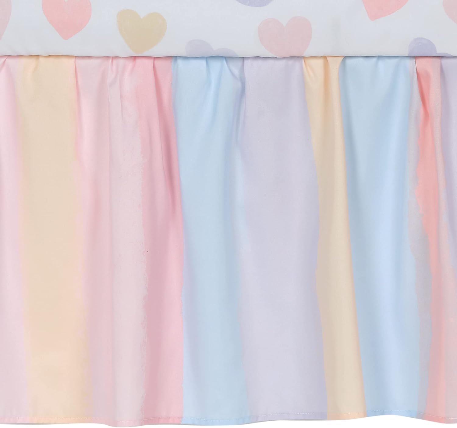 - Gorgeous shirred rainbow-colored crib skirt with 14.5" drop length