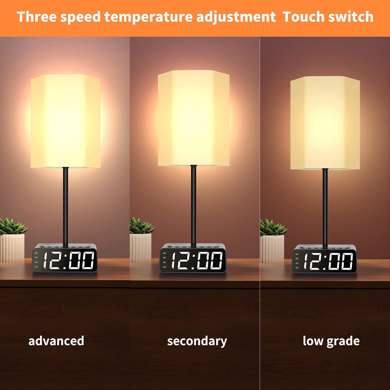 Table Lamp Alarm Clock with USB Ports and AC Outlet, Beside Lamp with Charging Station Speakers and Radio, Power Outlet with Touch Control 3-Way Dimmable Nightstand Lamp for Kids Study Room, Bedroom