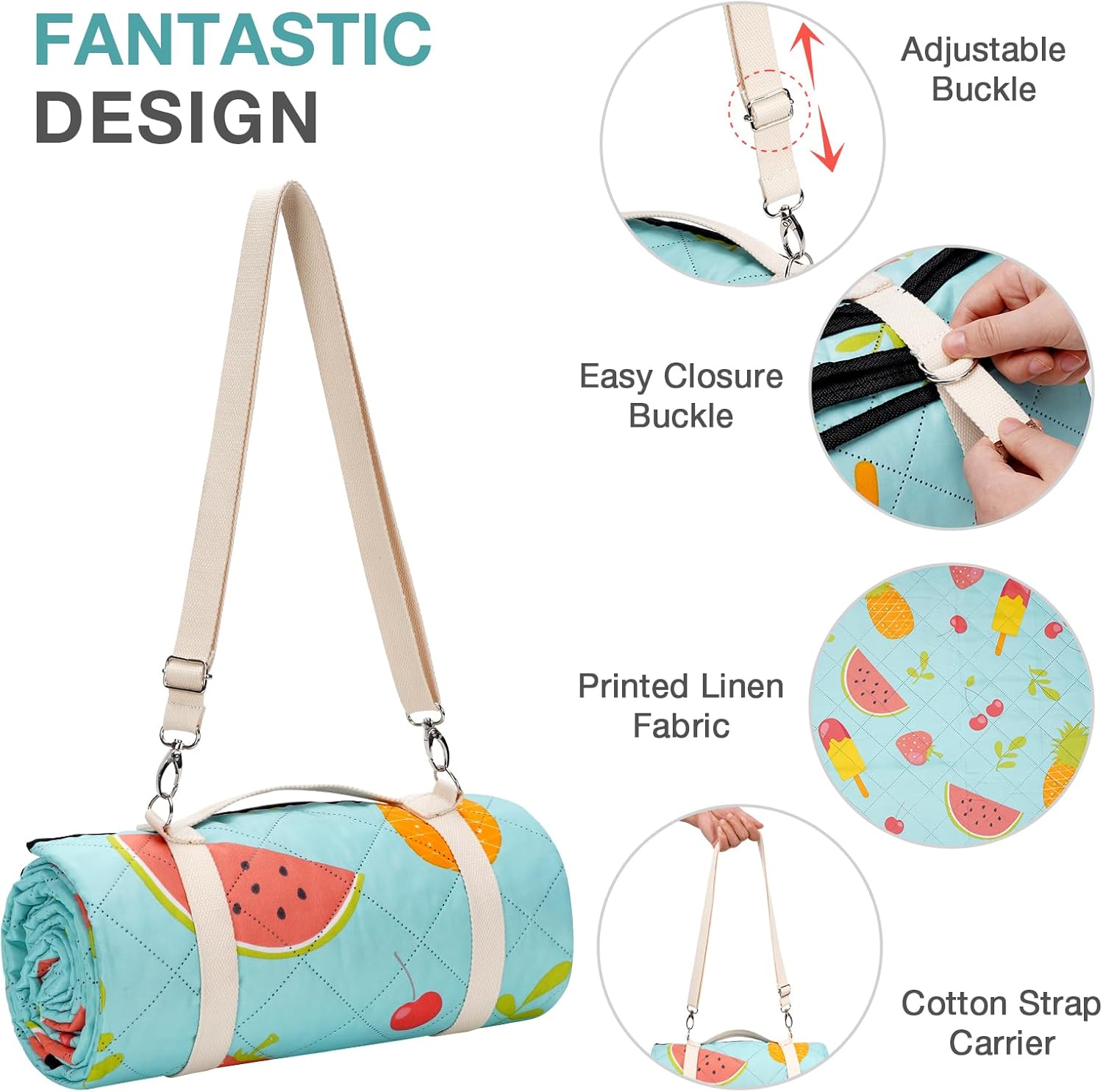 - HIGH QUALITY FABRIC: The top fabric is made of durable polyester, and printed with lovely summer fruits, closer to life and nature, the color printed is safe and fastened, not easy to fade as time goes. The soft cotton padded in the middle, making the picnic blanket soft and comfortable to sit and lie down.