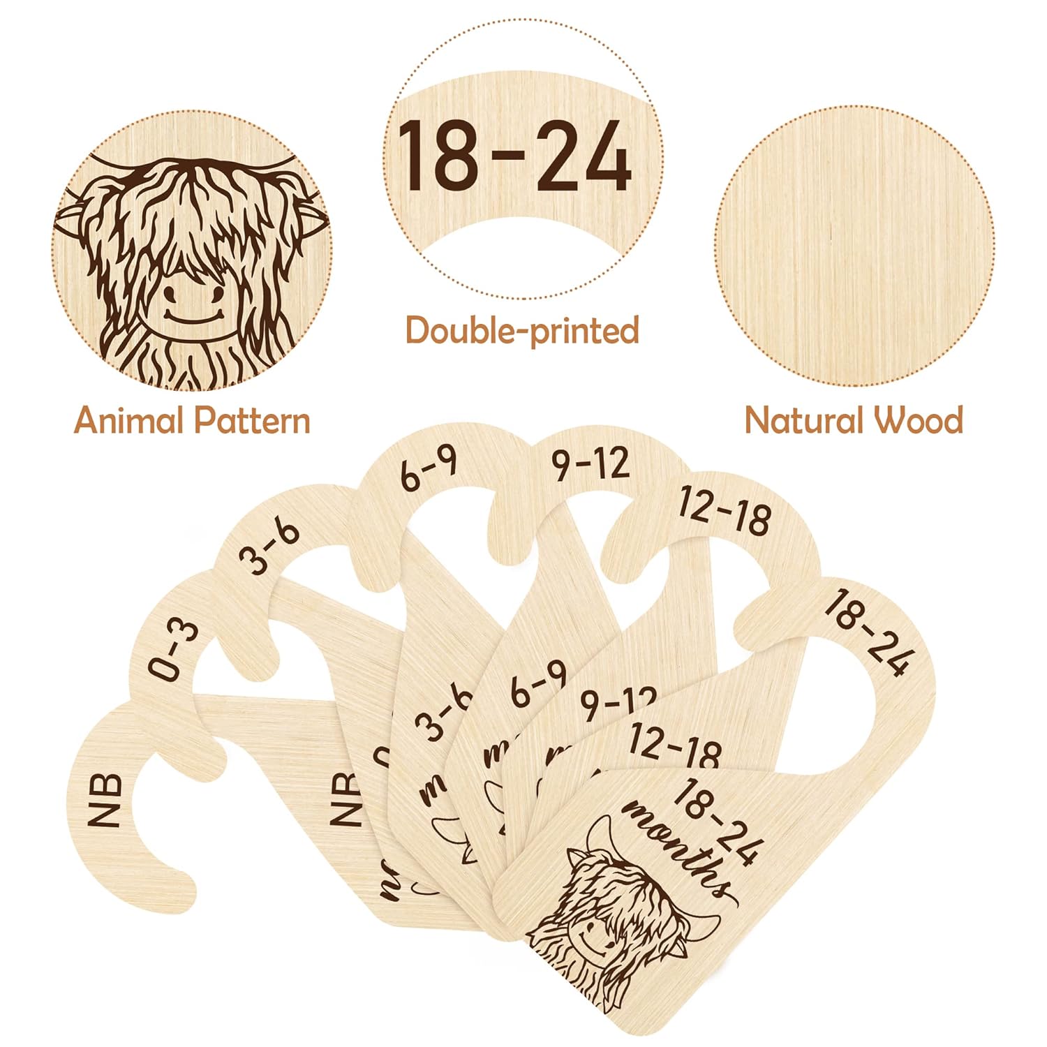 R HORSE 8Pcs Highland Cow Baby Closet Dividers, Double Sided Baby Closet Organizers Nursery Hanger Dividers Wood Size Dividers for Boy Girl Birthday Christmas Gift (0-24 Months)