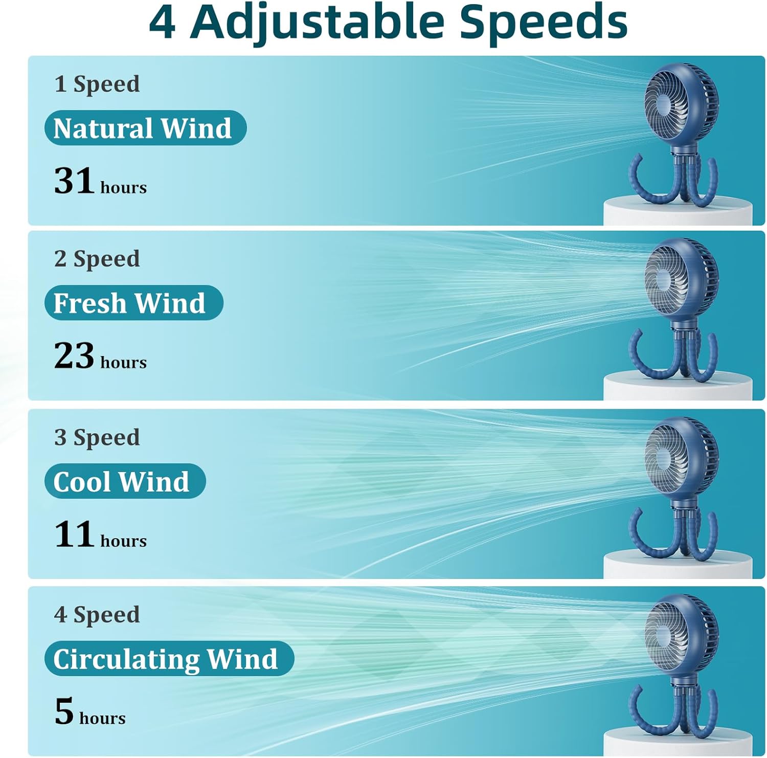 HandFan 4000mAh Battery Operated Stroller Fan Flexible Tripod Clip on Fan with 4 Speeds and Rotatable Max 31Hrs Handheld Personal Fans for Crib Car Seat Bike Treadmill (Blue)