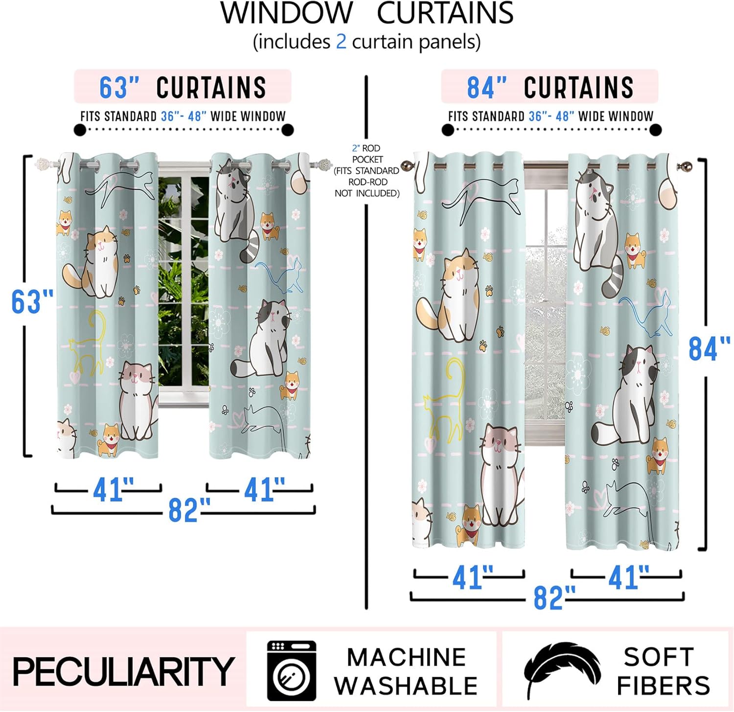 Cartoon Cat Blackout Curtains for Girls Room - Grommets Top, Animal Themed, Thermal Insulated Panels for Bedroom, Nursery Decor, 82 in x 84 in