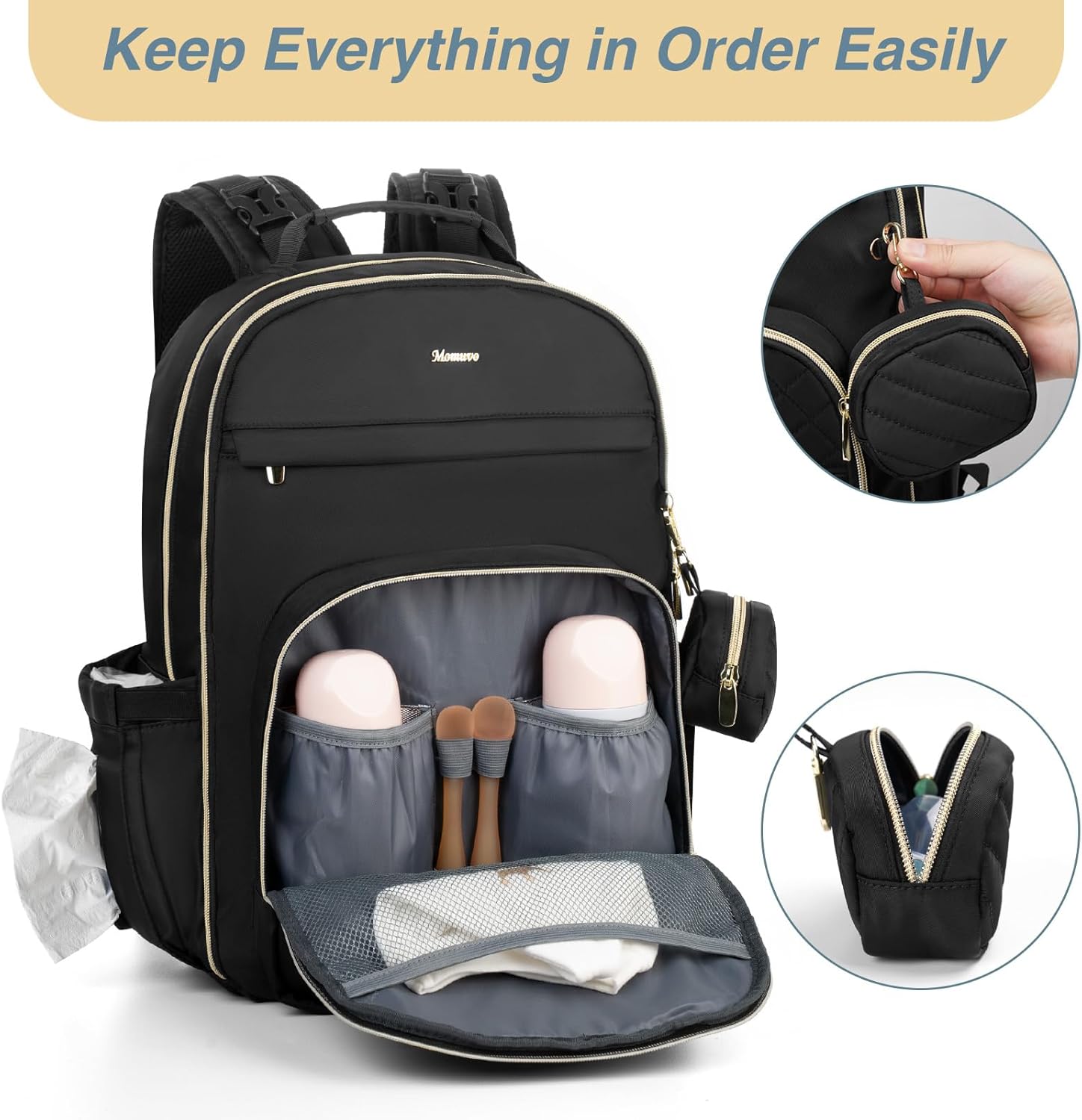 - Original design by Momuvo: This is a diaper bag full of details designed for parents with babies. You'll get a Large black diaper bag (size: 17.5'' x 12.9'' x 8'', 30L) with an easy wipe-clean foldable and waterproof changing pad (size: 26'' x 14"), featuring 2 built-in stroller straps, a detachable pacifier case, a separate waterproof section for dirty and wet clothes and diapers, main compartment with plenty of space to store all your baby stuff.