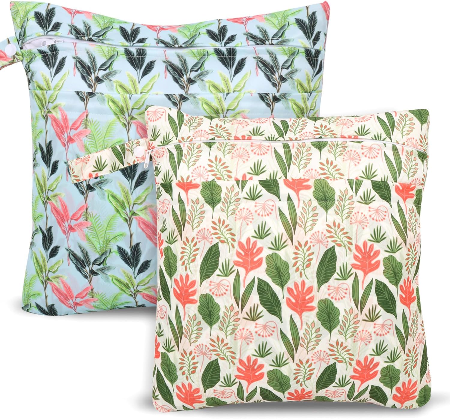 2pcs Cloth Diaper Wet Dry Bags, Waterproof Reusable Wet Bag with 2 Zipper Pockets & Handle, Washable Laundry Bags for Baby Adult Clothes Travel Beach Pool Daycare Yoga Gym Exercise Swimsuits,