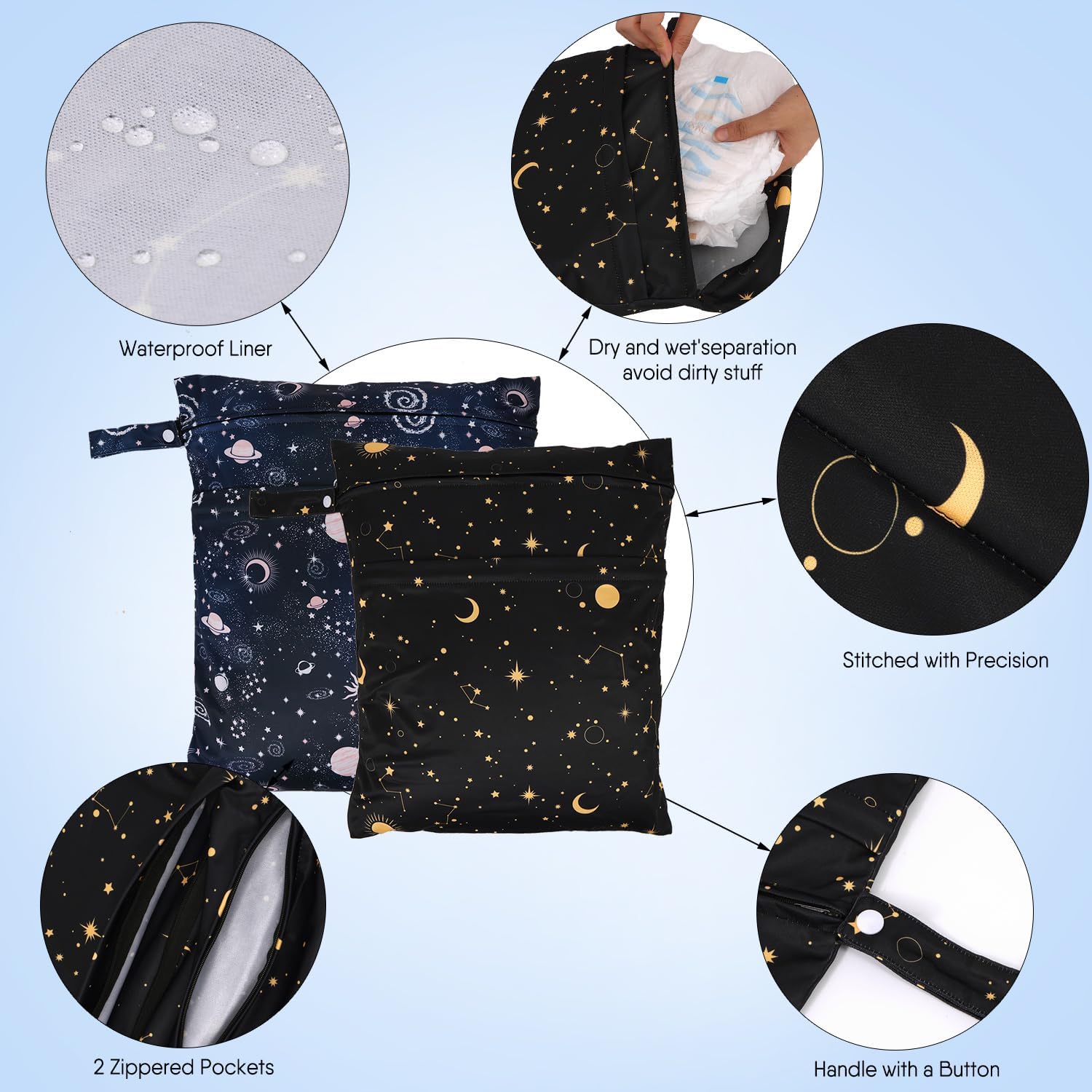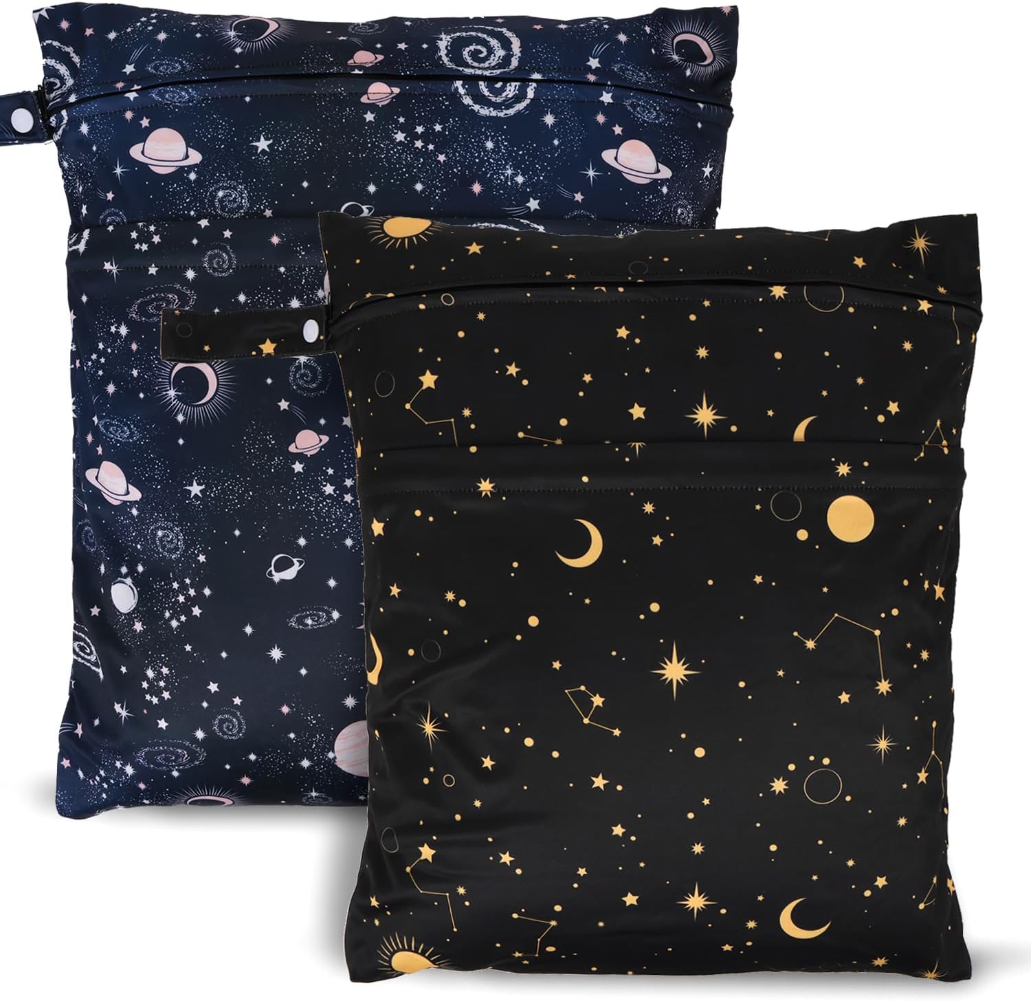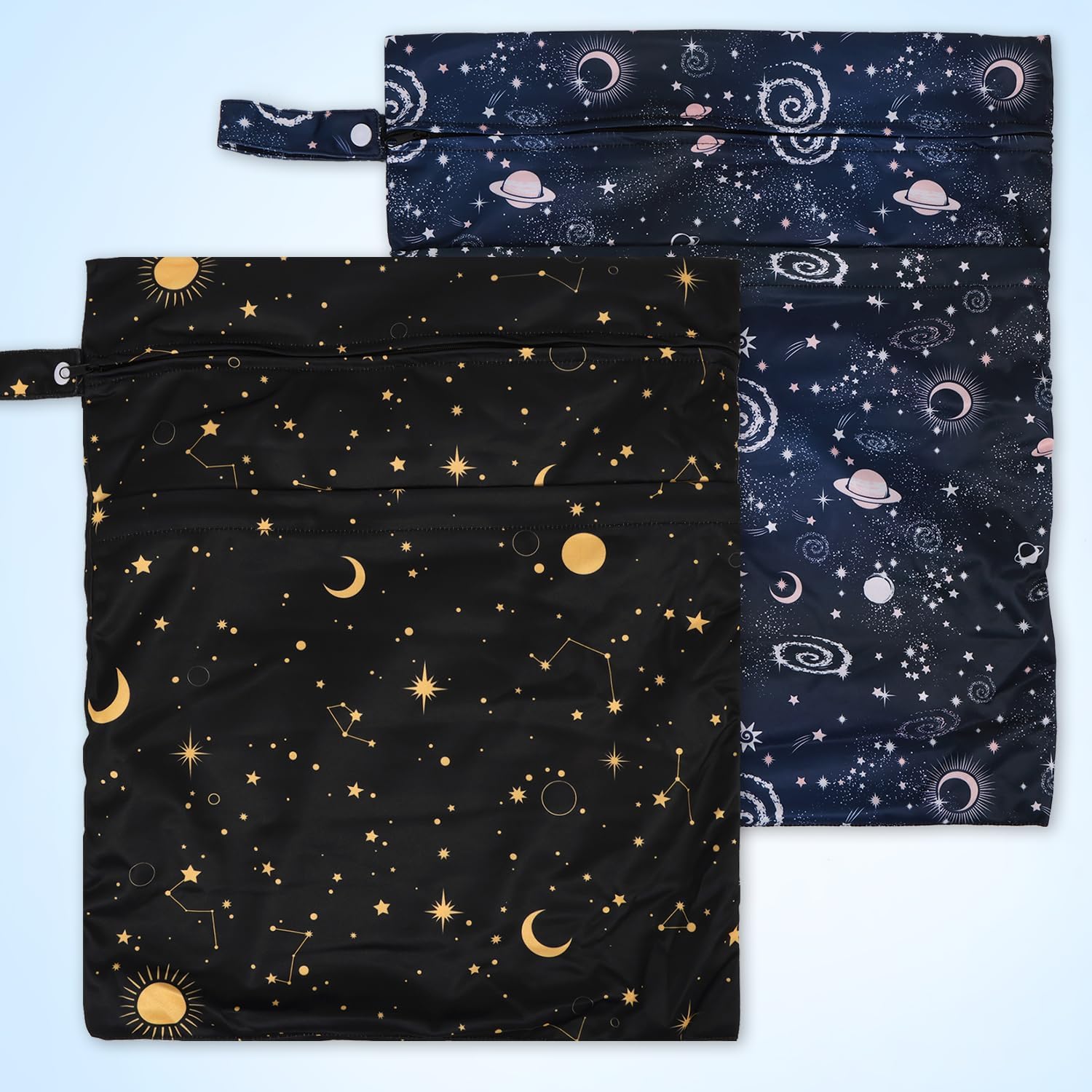 - 2 ZIPPERED POCKETS & HANDLE DESIGN: The 2 pack laundry bags are designed with 2 zippered compartments to keep wet and dry clothes separately, or separate dirty and clean diapers. Keep dry and clean. There's a handle with a button on one side for hanging up, convenient to carry and attach to your stroller, doorknob, towel rack, hook or handbag.