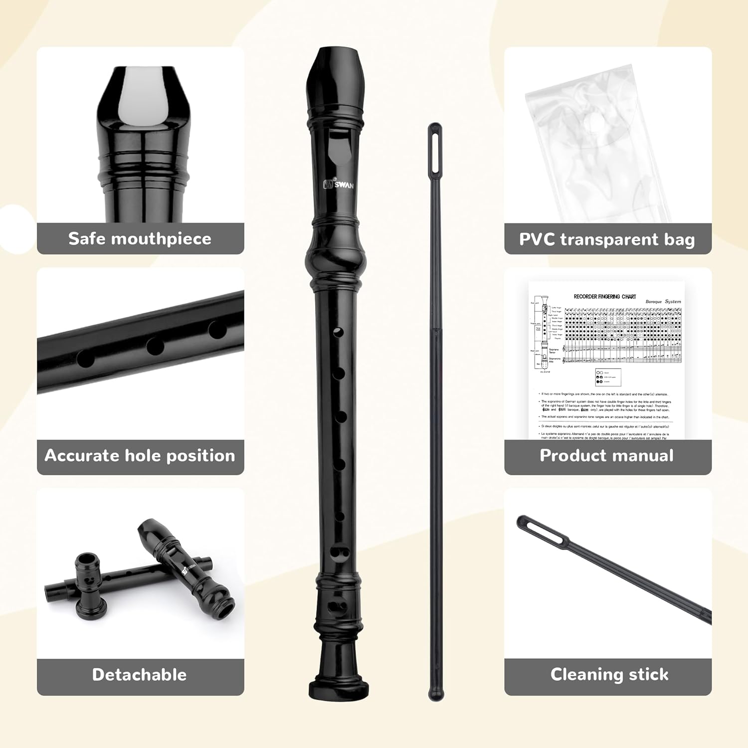 - SWAN recorder instrument is 3-piece detachable, easy to clean. The soprano recorder set comes with a cleaning stick that helps clean the inside of the recorder and keep it clean.