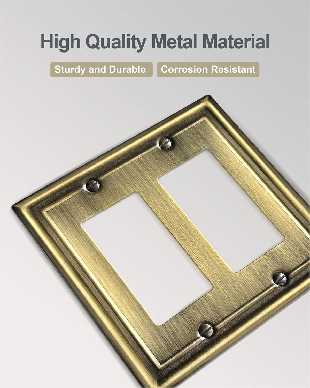 Double Decorator Wall Plates,Metal Electrical Outlet Covers for Receptacles, Dimmer Switches, GFCI Outlets, Antique Brass, 2-Gang, 2 Pack