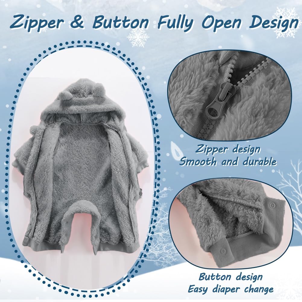 • Attentive Design: Attentive full-open zipper designed bear newborn outfit, zipper makes newborn fleece outfit easy to put on and take off, convenient snap design at the crotch diaper changing would be easier. The elastic mouth design of sleeve and leg ,warmer,freer