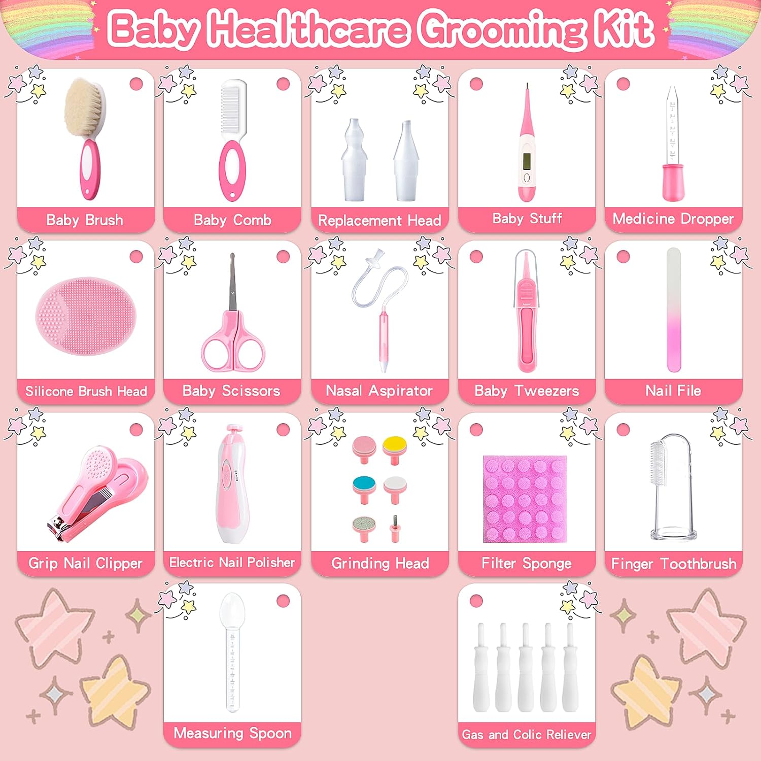 28 in 1 Baby Healthcare and Grooming Kit, Infant Baby Nursery Kit Electric Nail Trimmer Set with Gas Colic Passer Nasal Aspirator Nail Clipper Hair Brush Comb for Newborn Girls Boys (Pink)