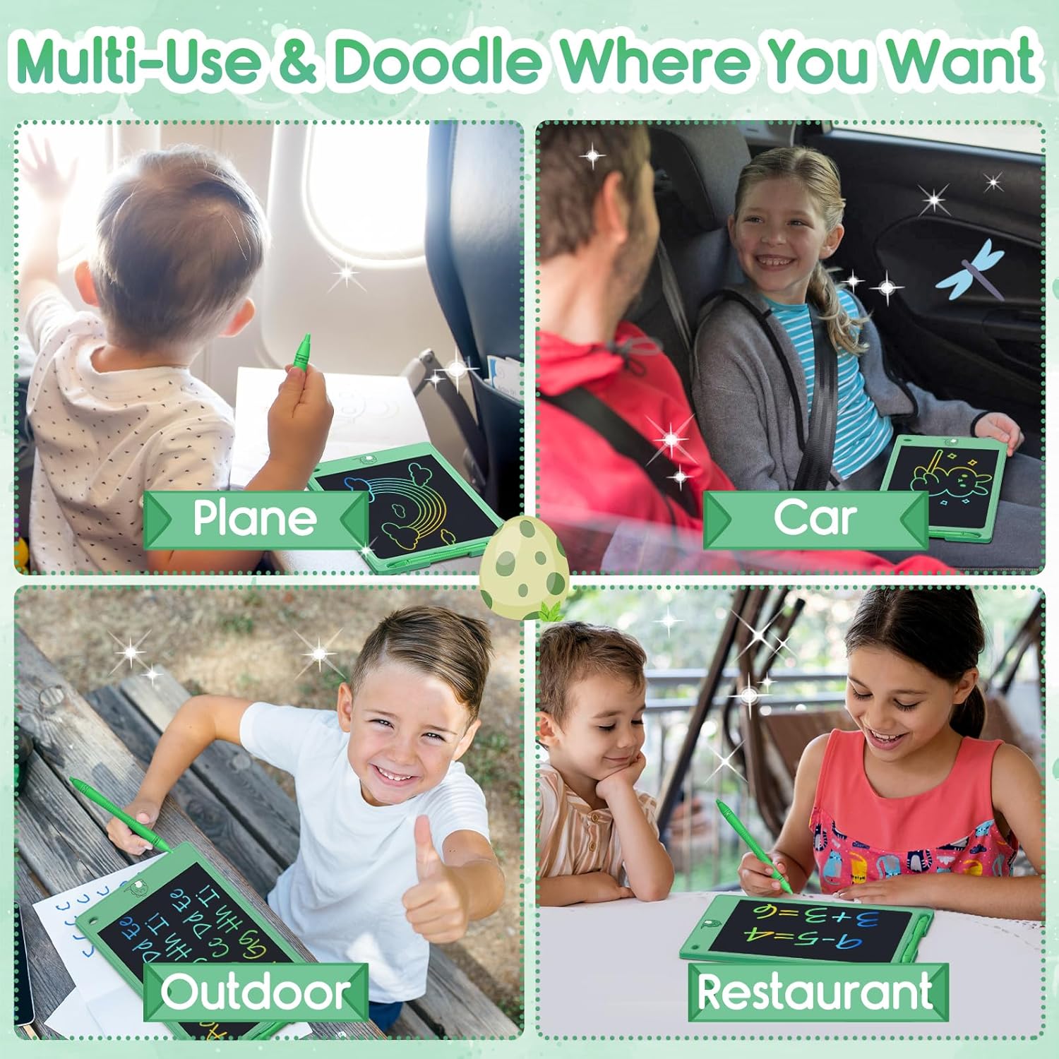- [Upgraded Colorful Drawing Pad, Unique Design with Cute Dinosaur]: Apply the newest flexible liquid crystal technology, brighter and clearer than most LCD writing tablet. Take pressure-sensitive technology, you can draw lines of different thicknesses through different pressure levels. Package includes 1 pack LCD writing tablets, 1 stylus pen, 1 string. Each unit come with well-made package box for gift giving. If you have twins, multi-kids, it's a great choice to buy several at one time.