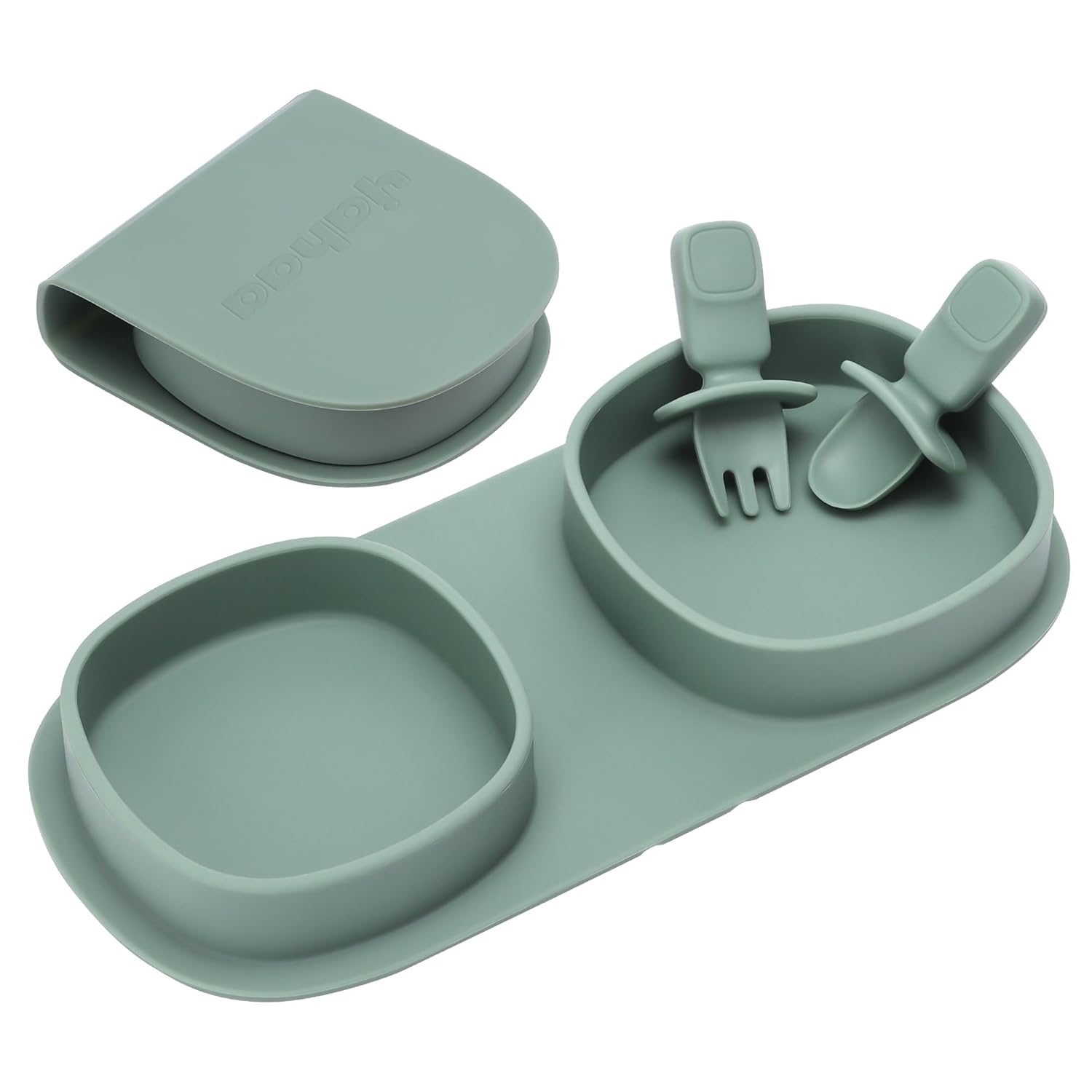Silicone Foldable Novelty Dinner Plates,Baby Plates Travel Essential with Forks and Spoons,Microwave & Dishwasher Safe,Sage