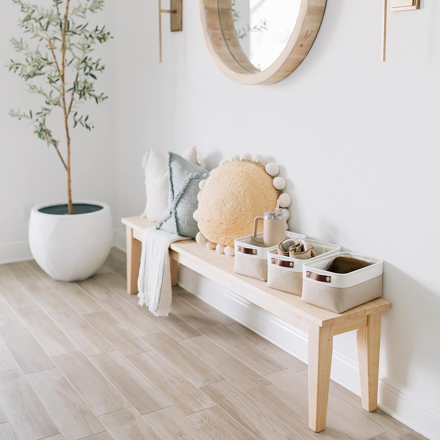 - Decorative Fabric and Vegan Leather โ These versatile storage baskets for organizing your everyday life are made with a thick, high-quality fabric and fitted with leather handles to add a stylish touch to a living room, bedroom, office, or personal space.