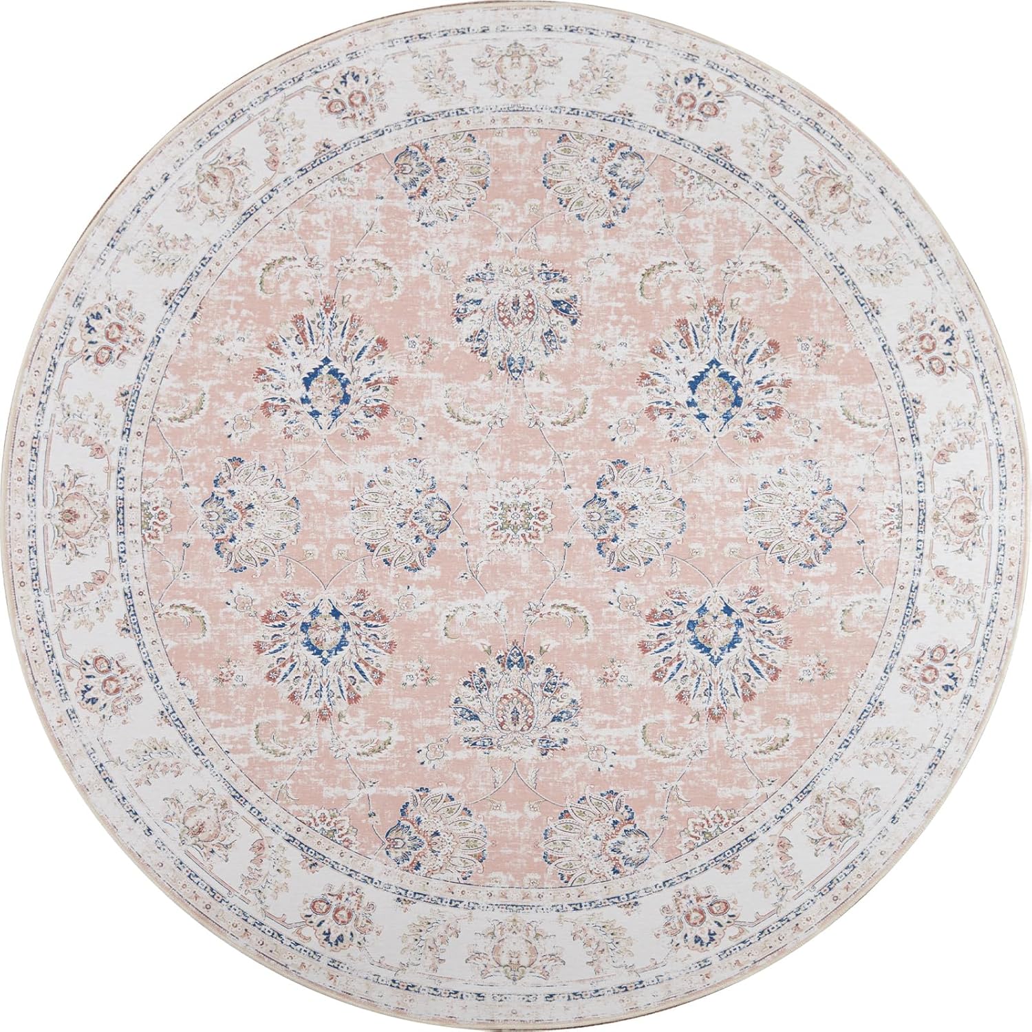 jinchan Round Rug 4ft Area Rugs Vintage Floral Distressed Design - Machine Washable Non-Slip Low-Pile Ultra-Thin Circle Rug for Entryway Bedside Living Room Dining Room Bedroom (4' Round,Pink)
